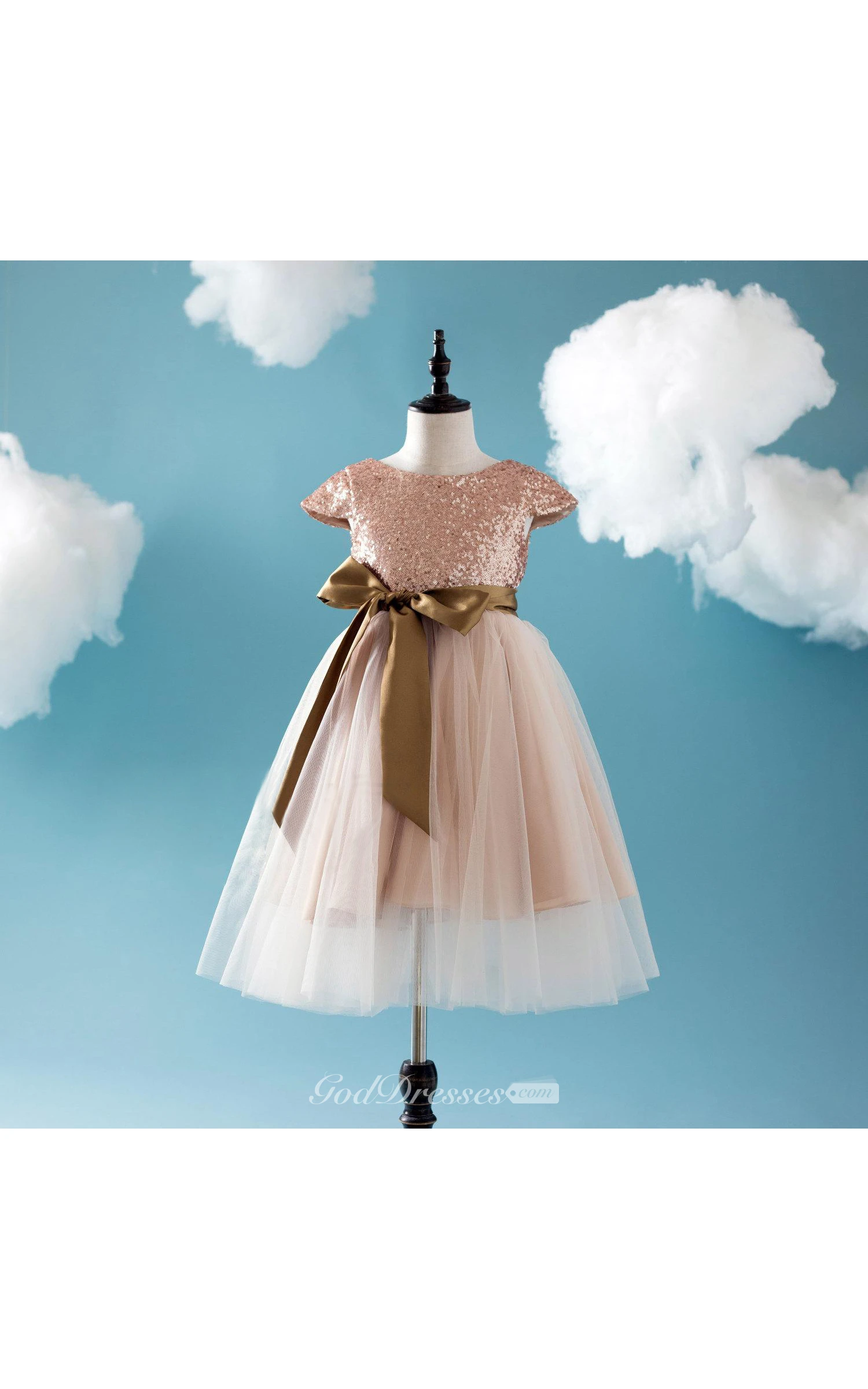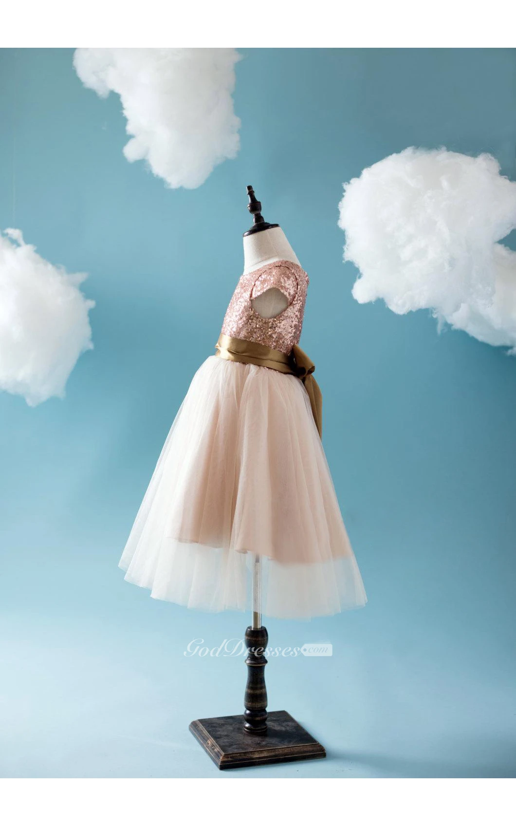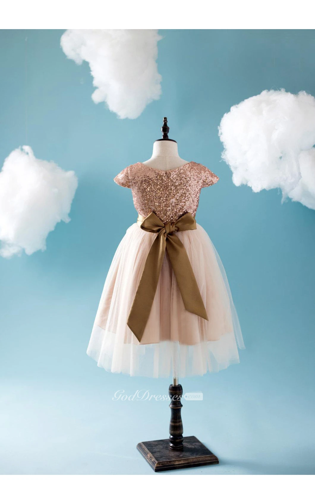 Scoop Neck Cap Sleeve Tulle Ball Gown With Sequined Bodice and Sash