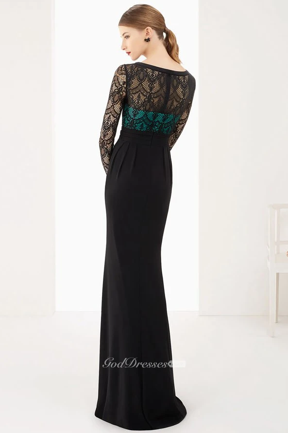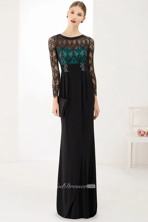 Scoop Neck Long Sleeve Sheath Chiffon Long Prom Dress With Lace Top