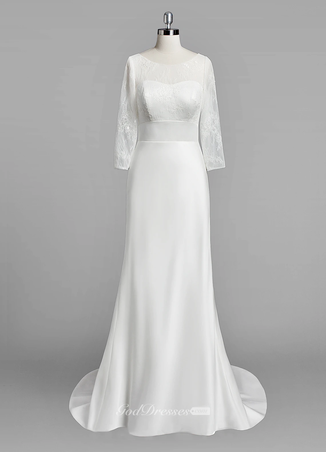 Scoop Neck Long Sleeve Sheath Satin Wedding Dress With Lace Bodice