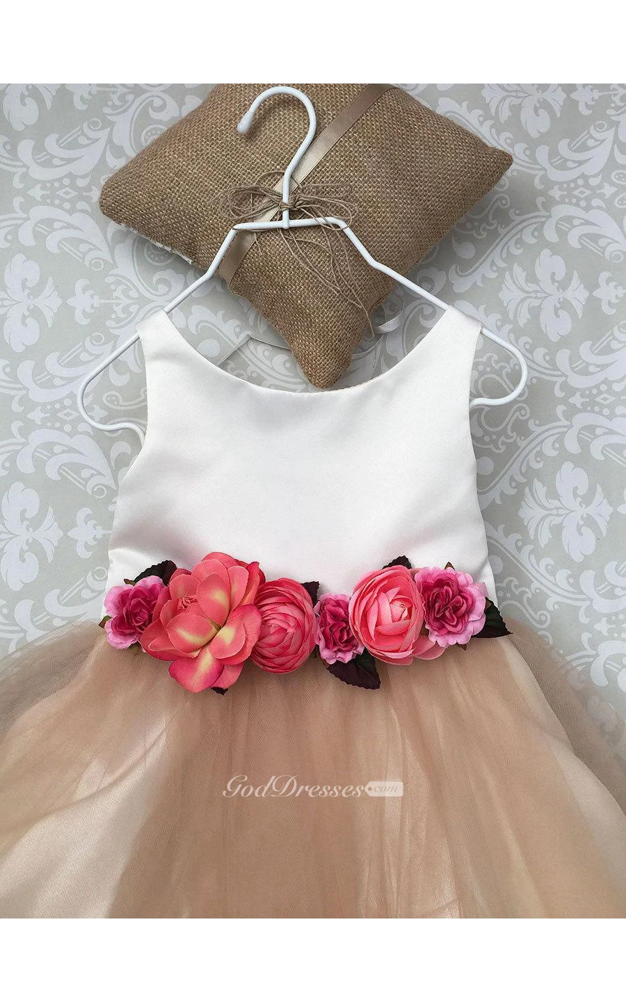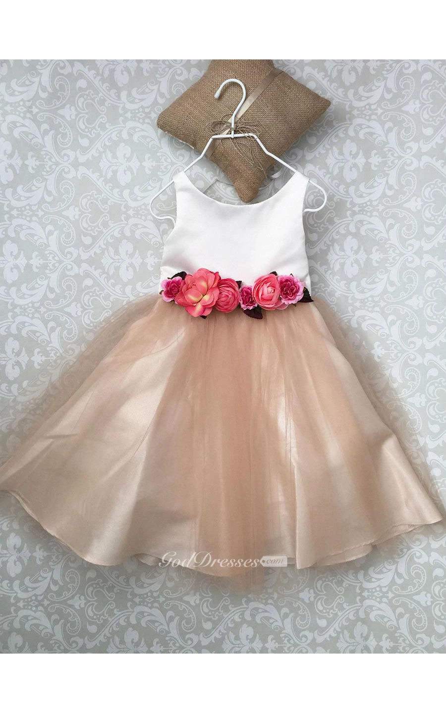 Scoop Neck Sleeveless A-line Tulle Knee Length Dress With Waist Flowers