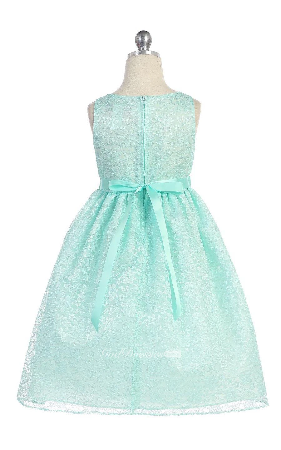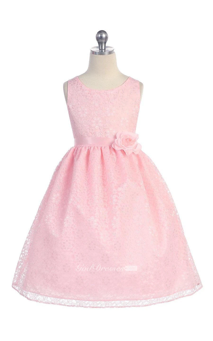 Scoop Neck Sleeveless Pleated Allover Lace Ball Gown With Flower Sash