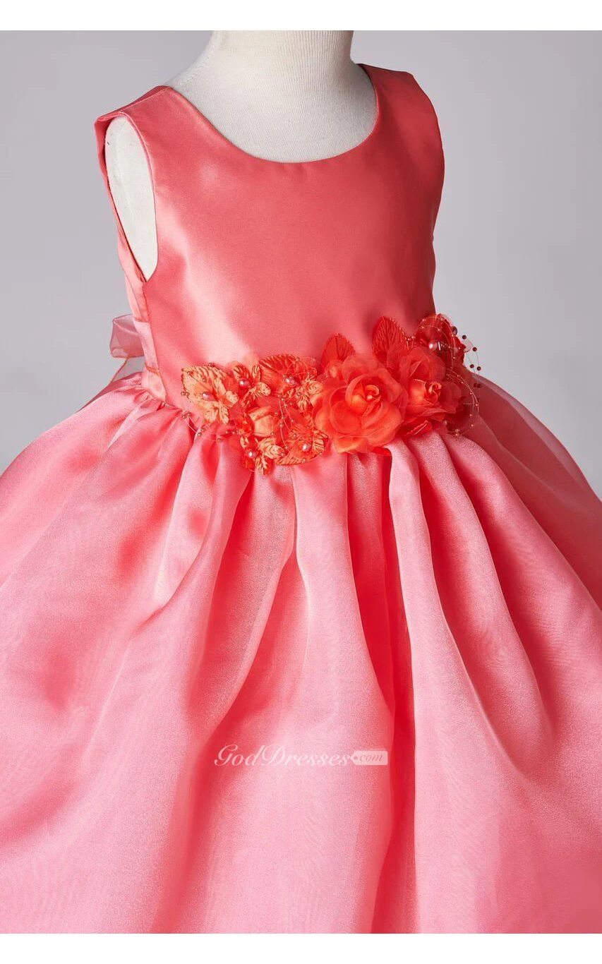 Scoop Neck Sleeveless Tea Length Pleated Organza Dress With Flower Sash