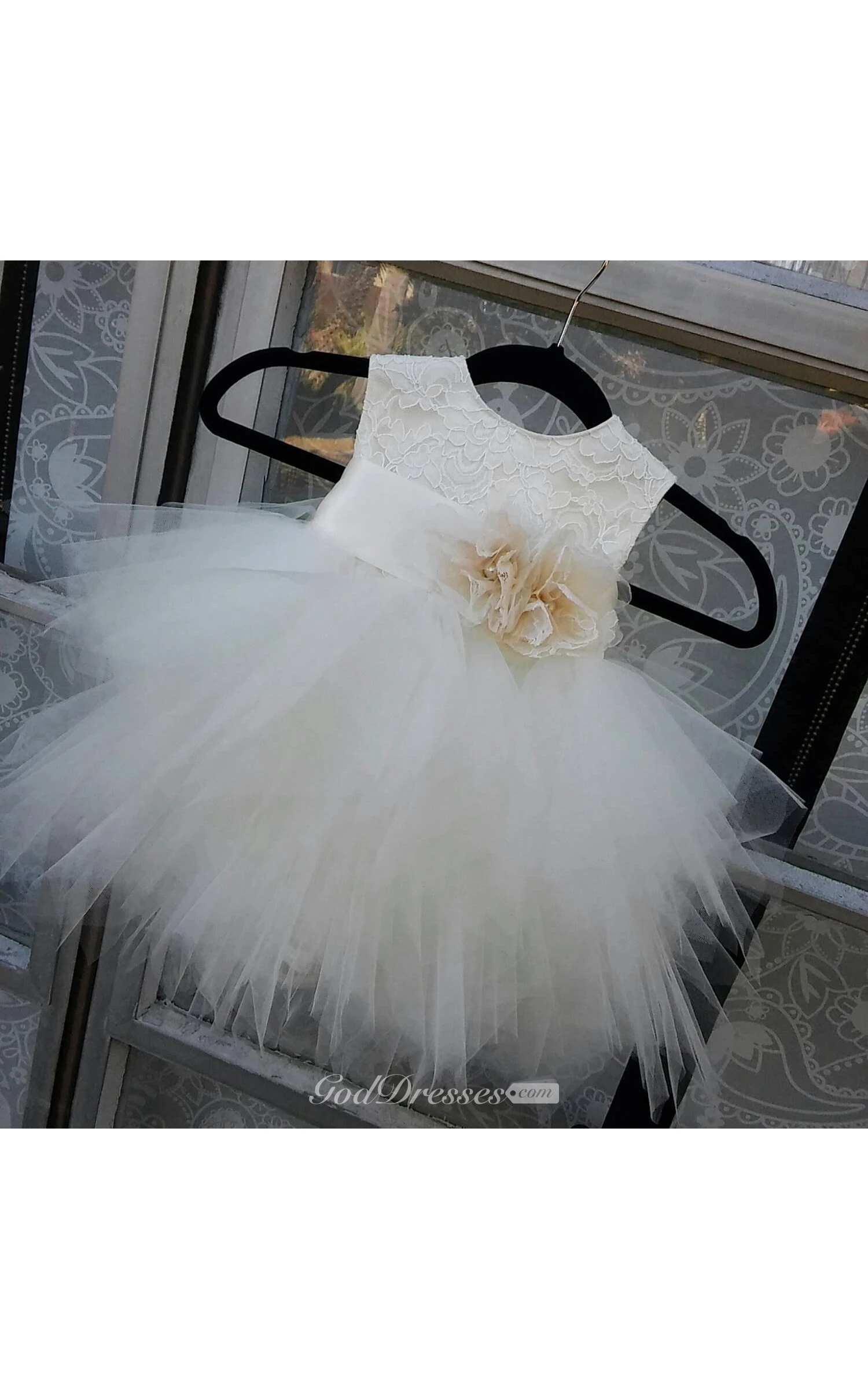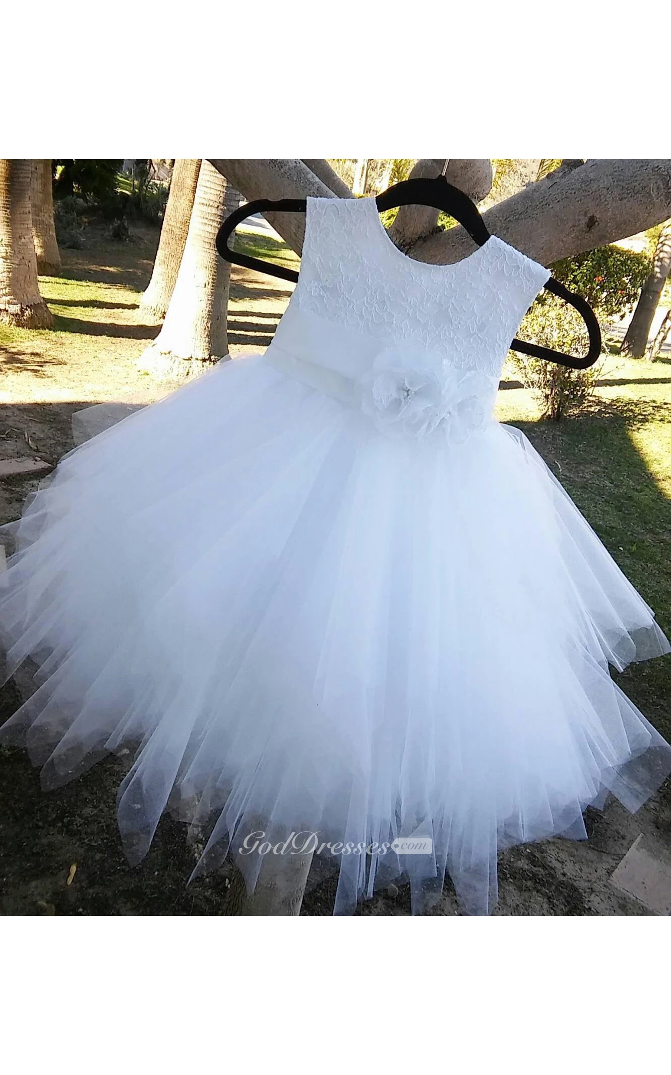 Scoop Neckline Layered Tulle Ball Gown With Waist Flower