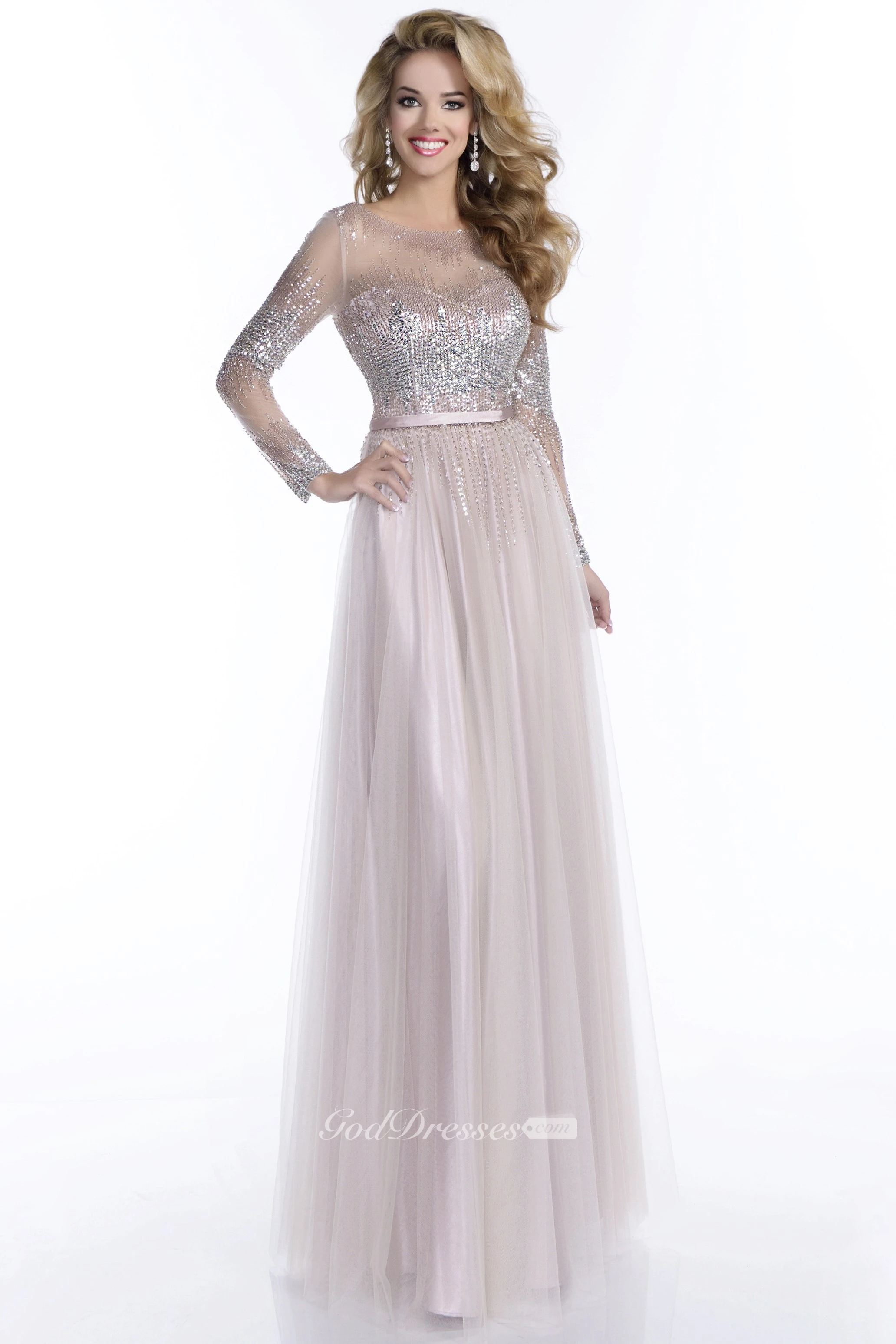 Sequined Bodice A-Line Tulle Prom Dress With Keyhole Back And Long Sleeve