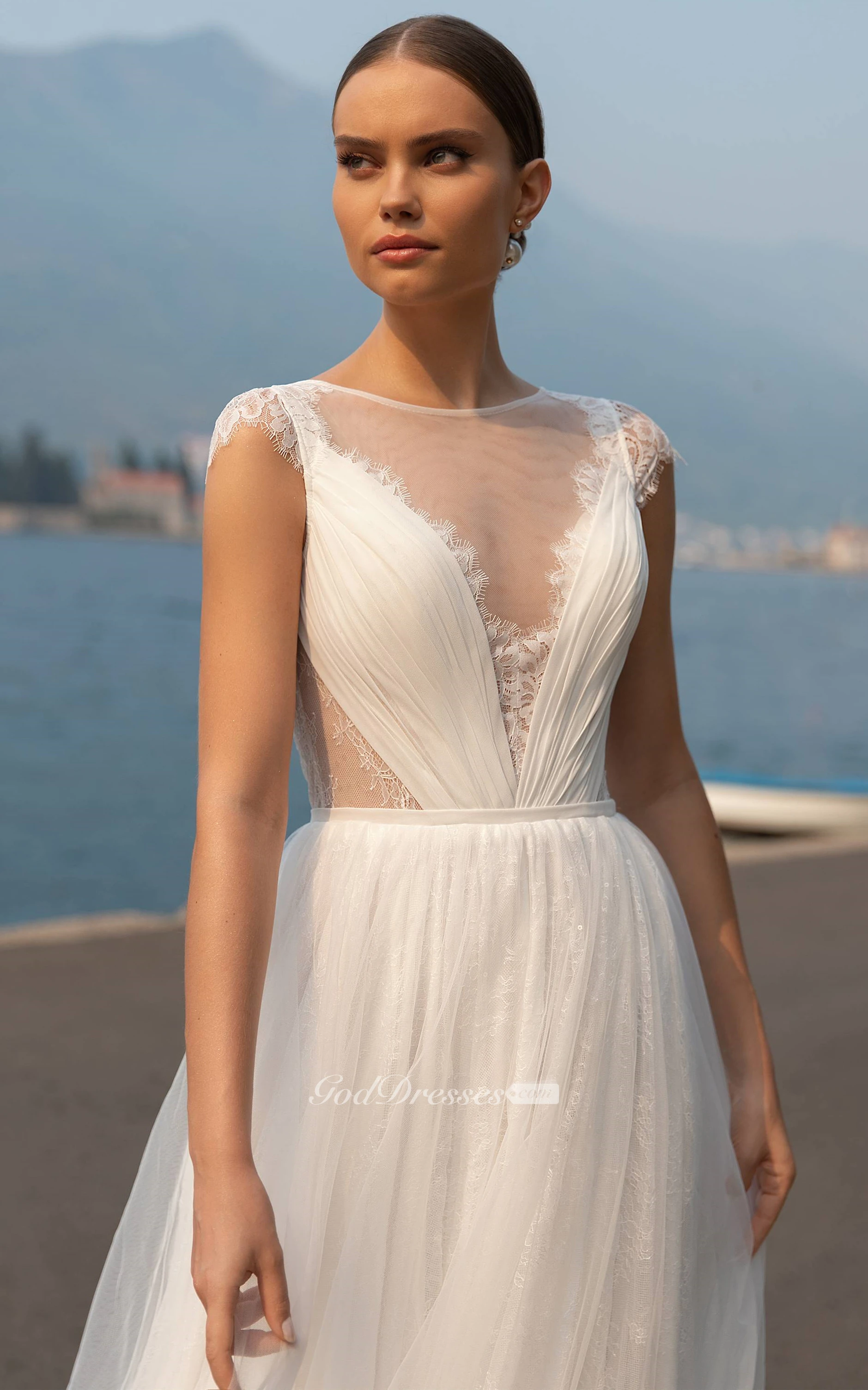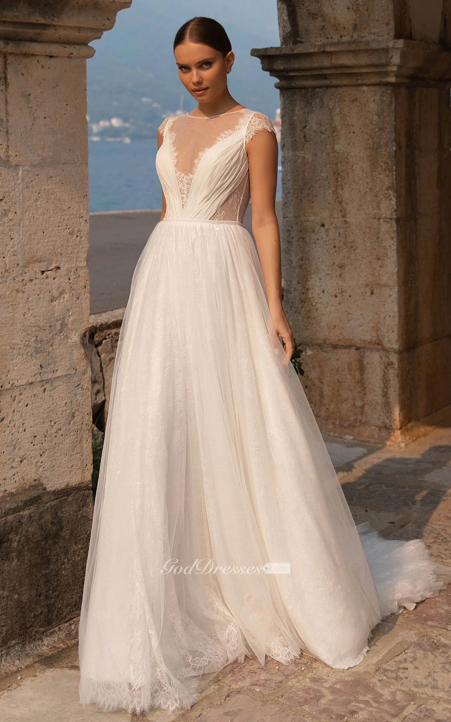 Sexy A Line Court Train Tulle Wedding Gown with Ruching