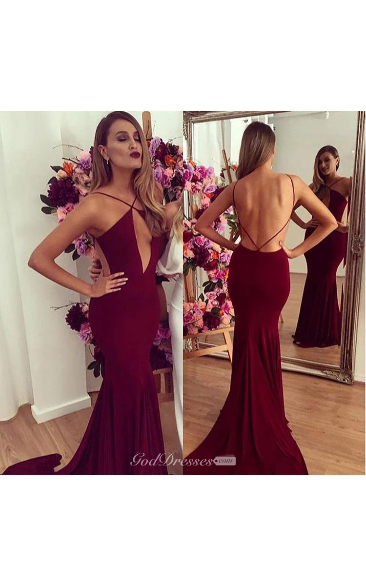 Sexy Backless Mermaid Burgundy Prom Dresses Floor Length