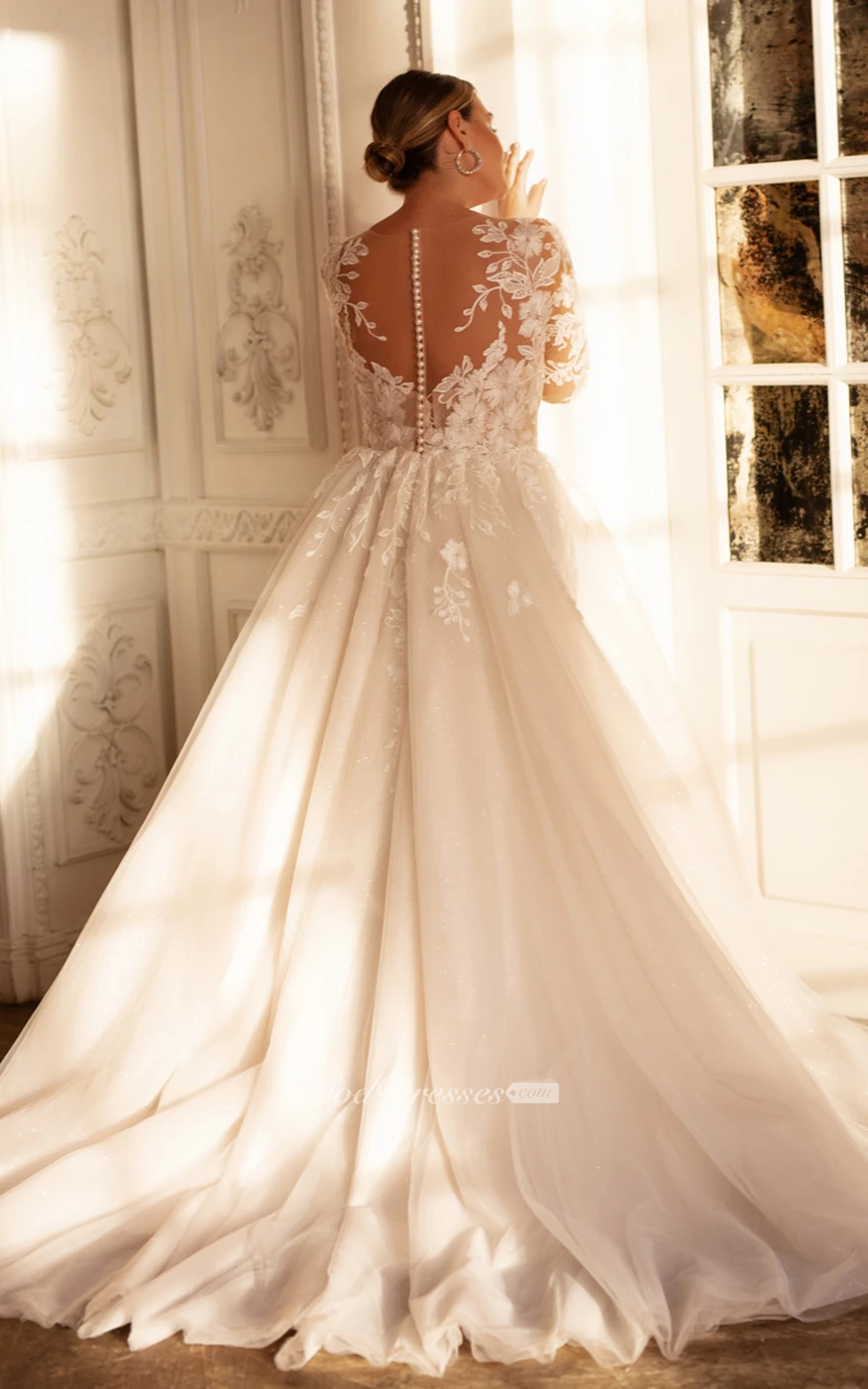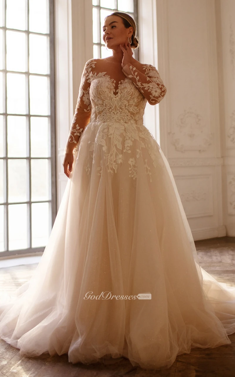 Sexy Plus Size Ball Gown Bateau Lace Illusion Tulle A-line Sweep Train Wedding Dress with Appliques