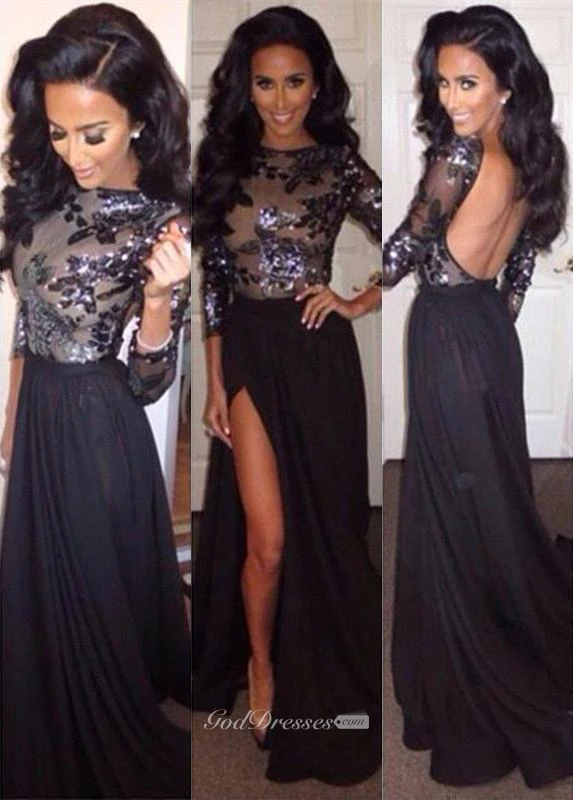 Sexy Chiffon Black Front Split Prom Dress Sequins Backless