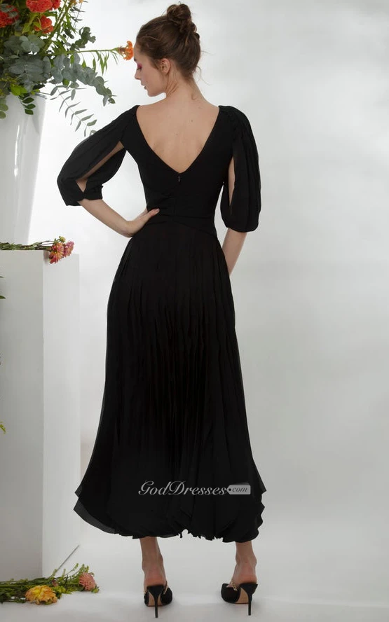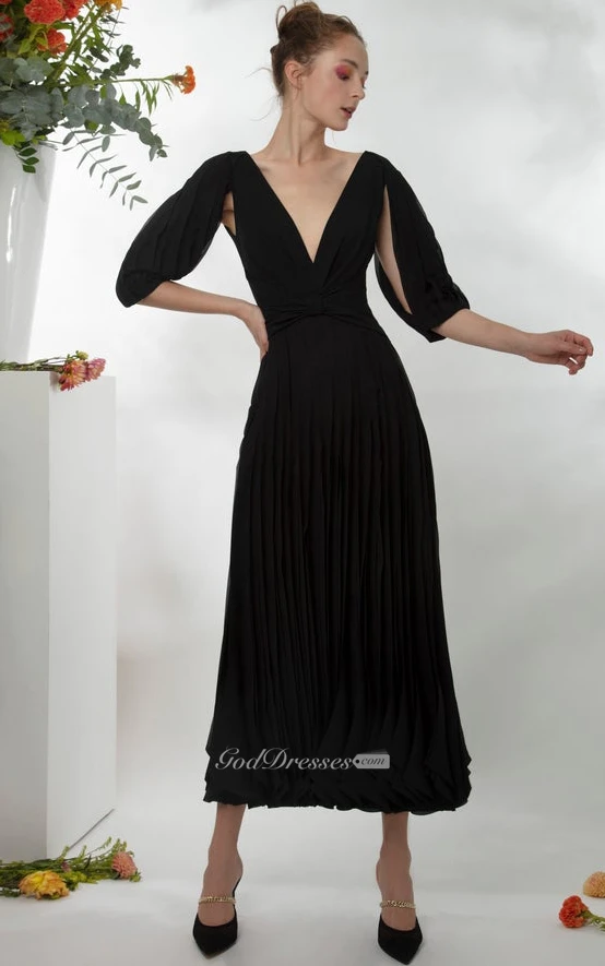 Sexy Chiffon Plunging Neckline Half Sleeve Ruching Cocktail Dress With Low-V Back