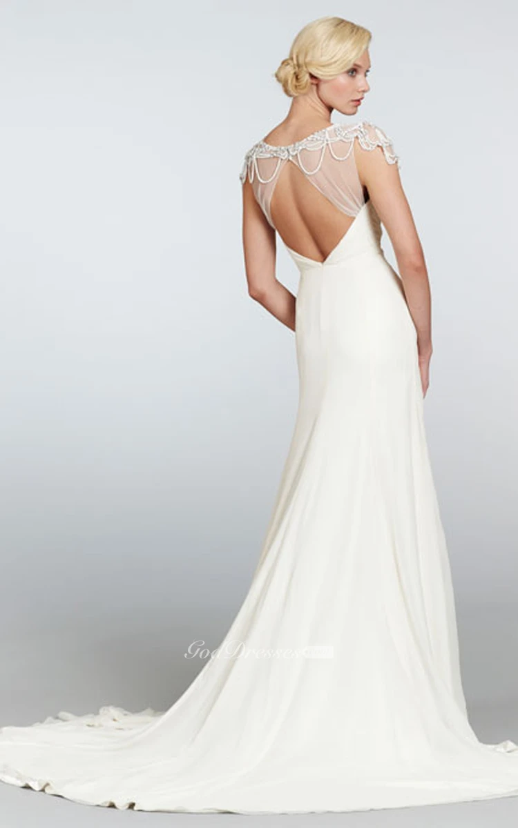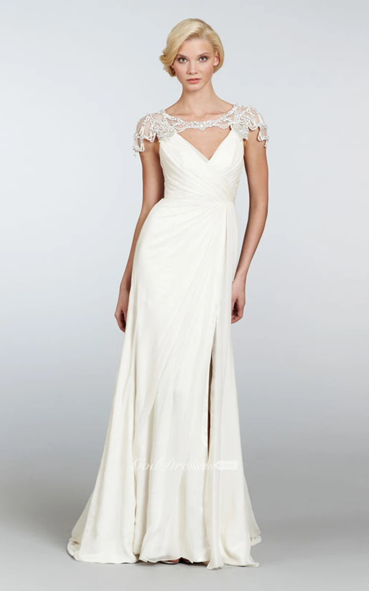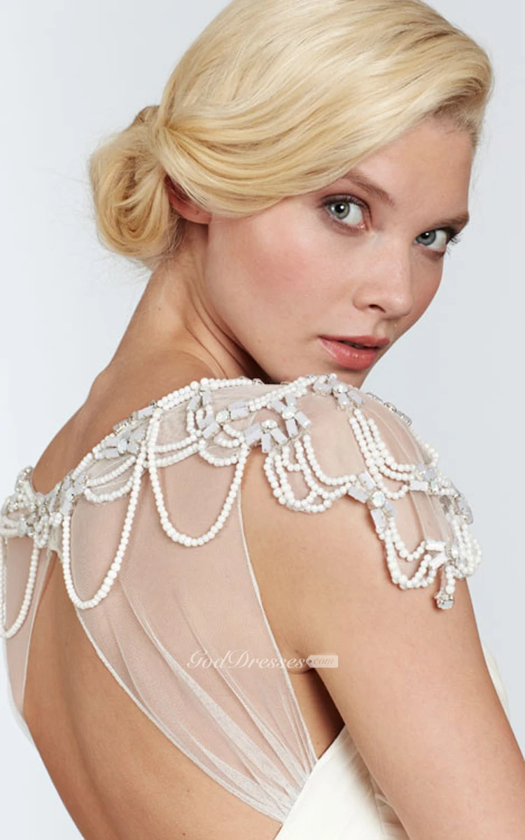 This enticing feminine gown is meant to bemuse. Sweetheart neckline ruched bodice is crisscrossed in surplice style. Sheath silhouette floor length skirt features a side draping and provocative high slit alluringly demonstrating your perfect legs. Elegant chapel train and illusion pearl beaded shoulder draping detail adds luxurious touch to this recherché dress.