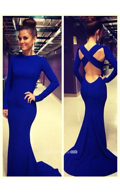 Sexy De Soiree Robe Mermaid Evening Dress High Neck Criss Cross Backless Royal Blue Prom Dresses With Long Sleeve