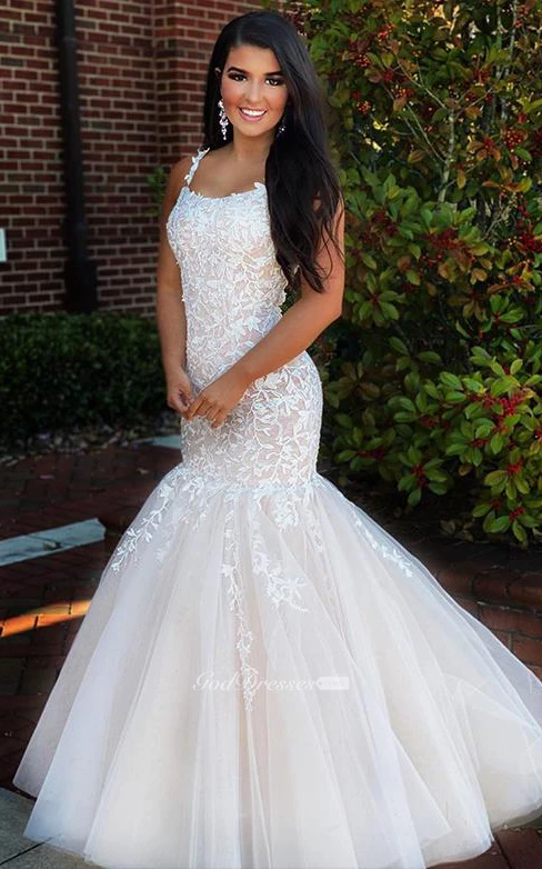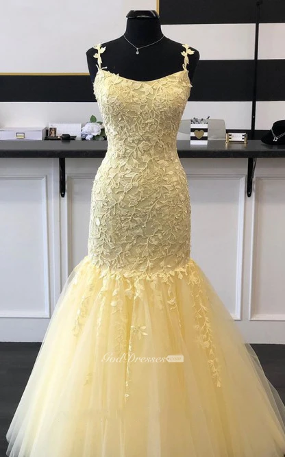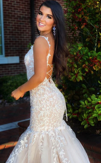 Sexy Lace Tulle Mermaid Spaghetti Sleeveless Prom Dress With Straps Appliques