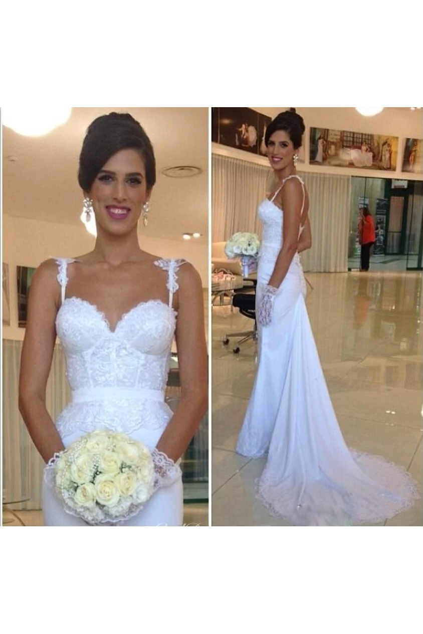 Sexy Mermaid Summer Spaghetti Straps Lace Appiqued Beaded Bridal Gown