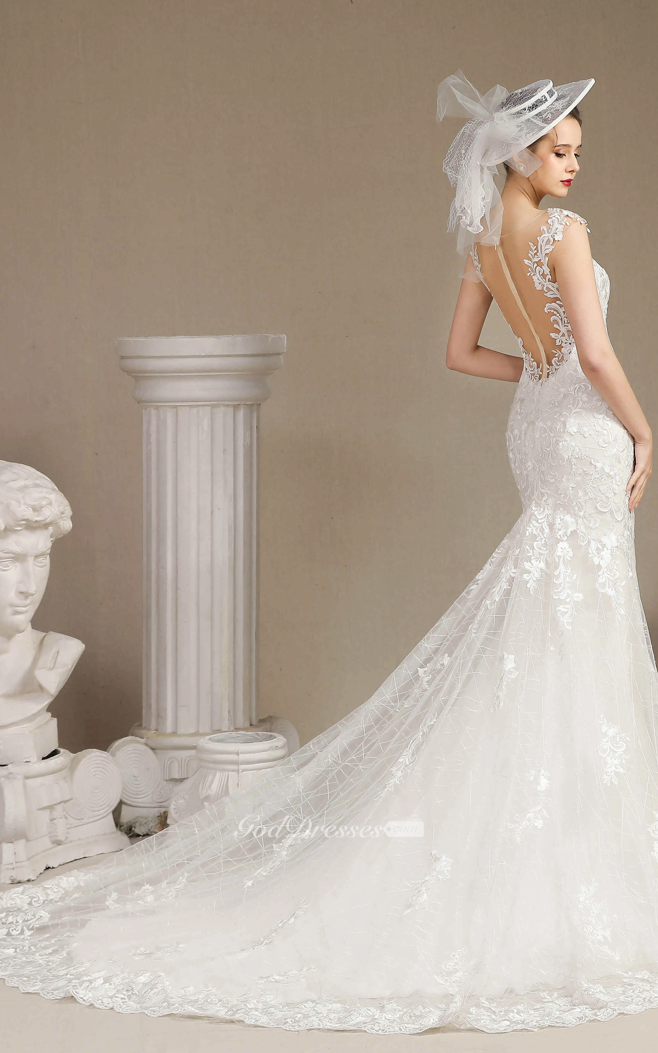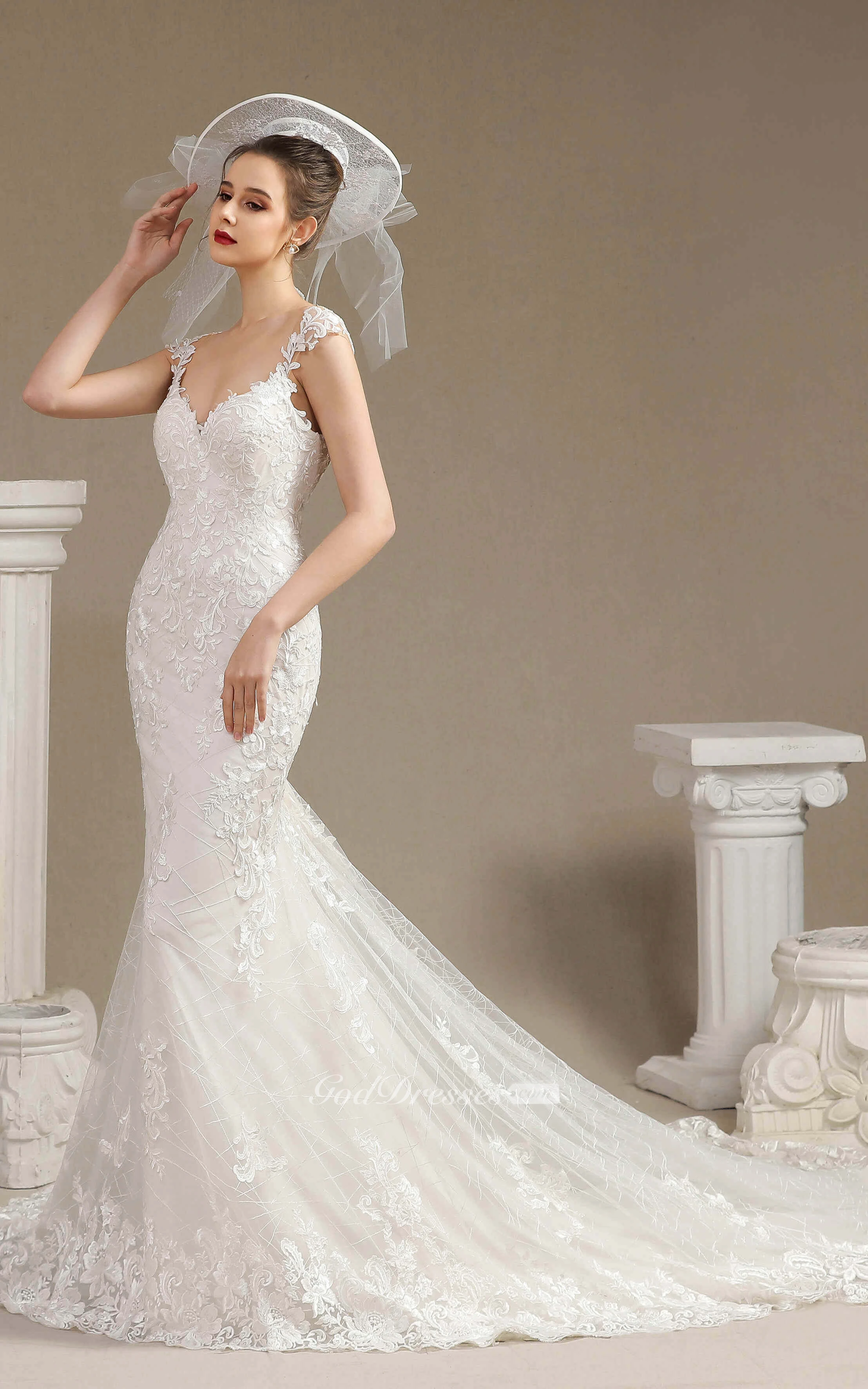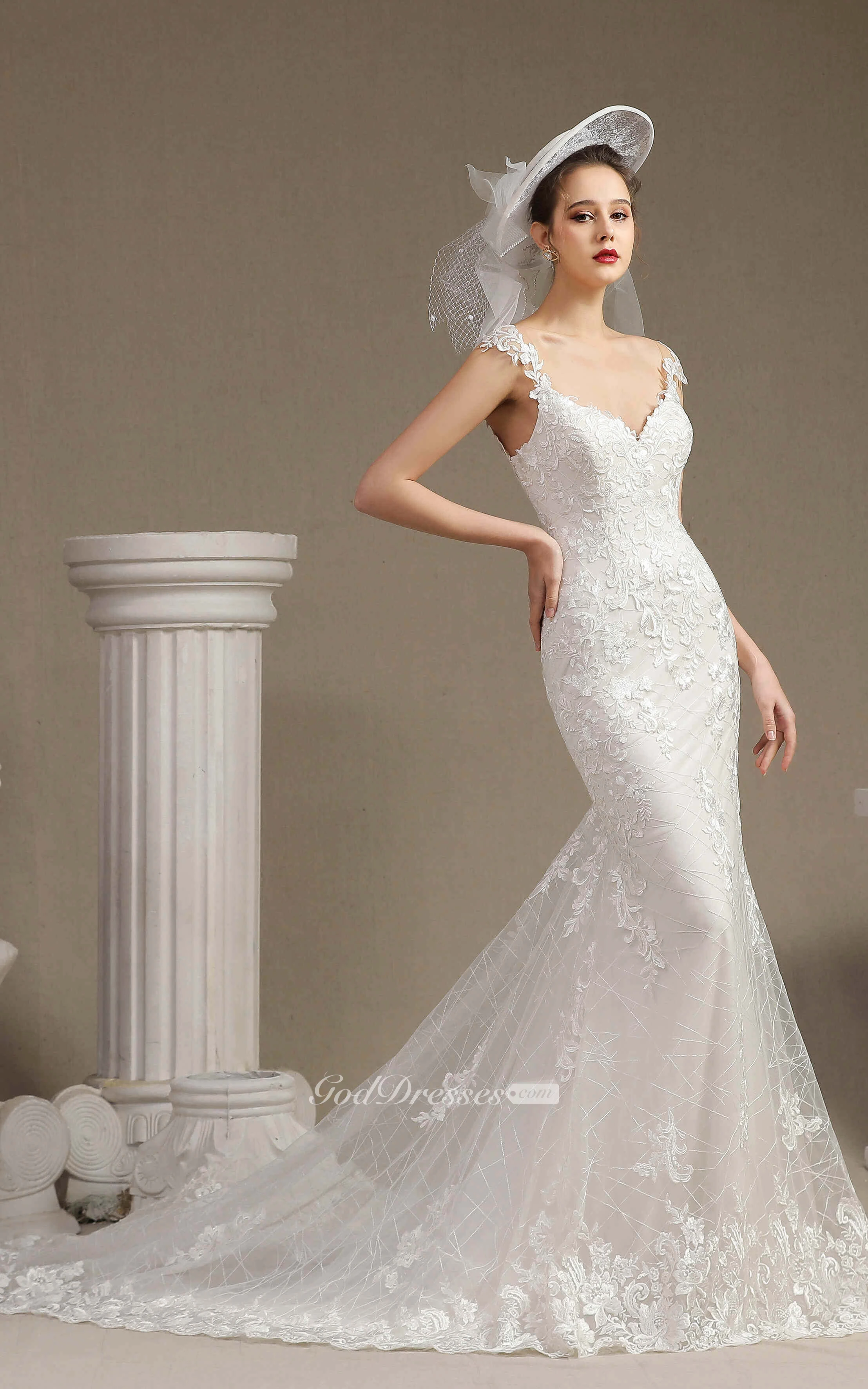 Sexy Mermaid V-neck Wedding Gown With Appliqued Straps Illusion Back And Lace