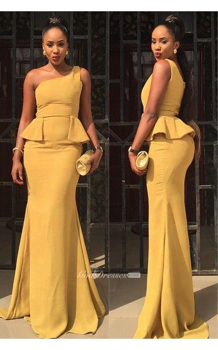 Sexy One Shoulder Mermaid Yellow Prom Dress Ruffles Sweep Train