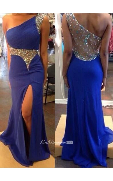 Sexy One Shoulder Royal Blue Evening Party Dress Split Prom Dress With Crystal Beadings