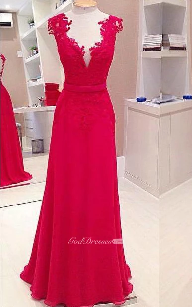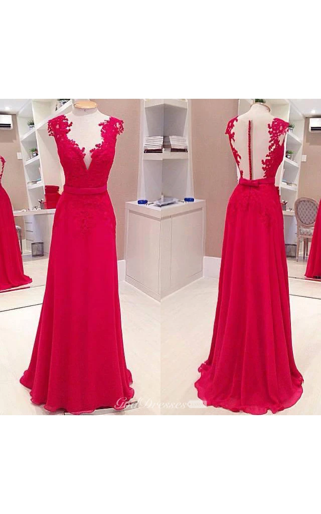 Sexy Red Deep V-Neck Prom Dresses Sleeveless Chiffon Evening Dresses With Bowknot