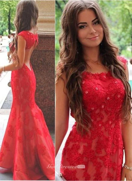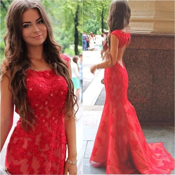 Sexy Red Lace Appliques Mermaid Evening Dress Sweep Train Jewel