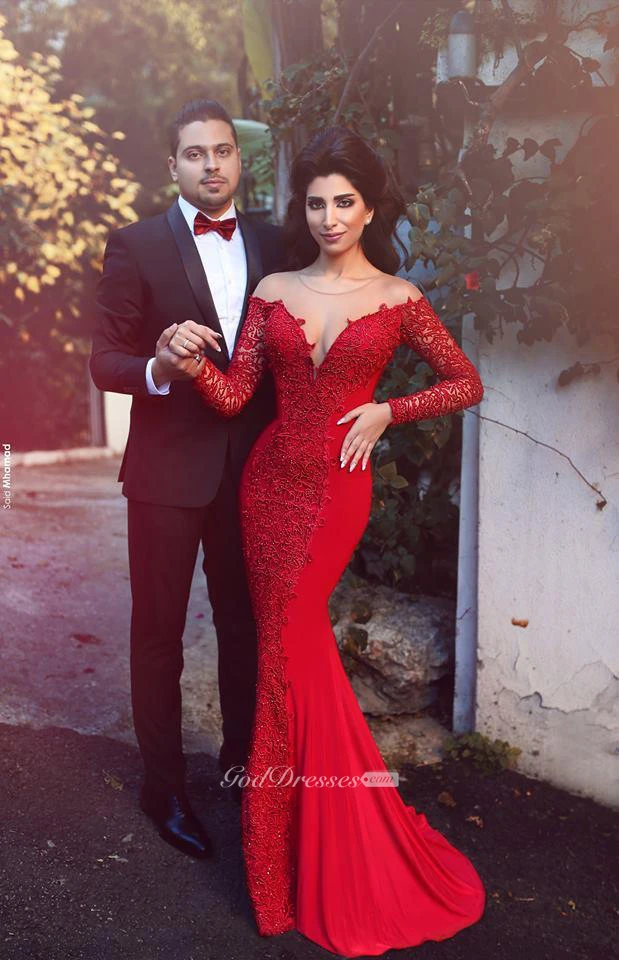 Sexy Red Long Sleeve Lace Evening Dress Mermaid Zipper Button Back