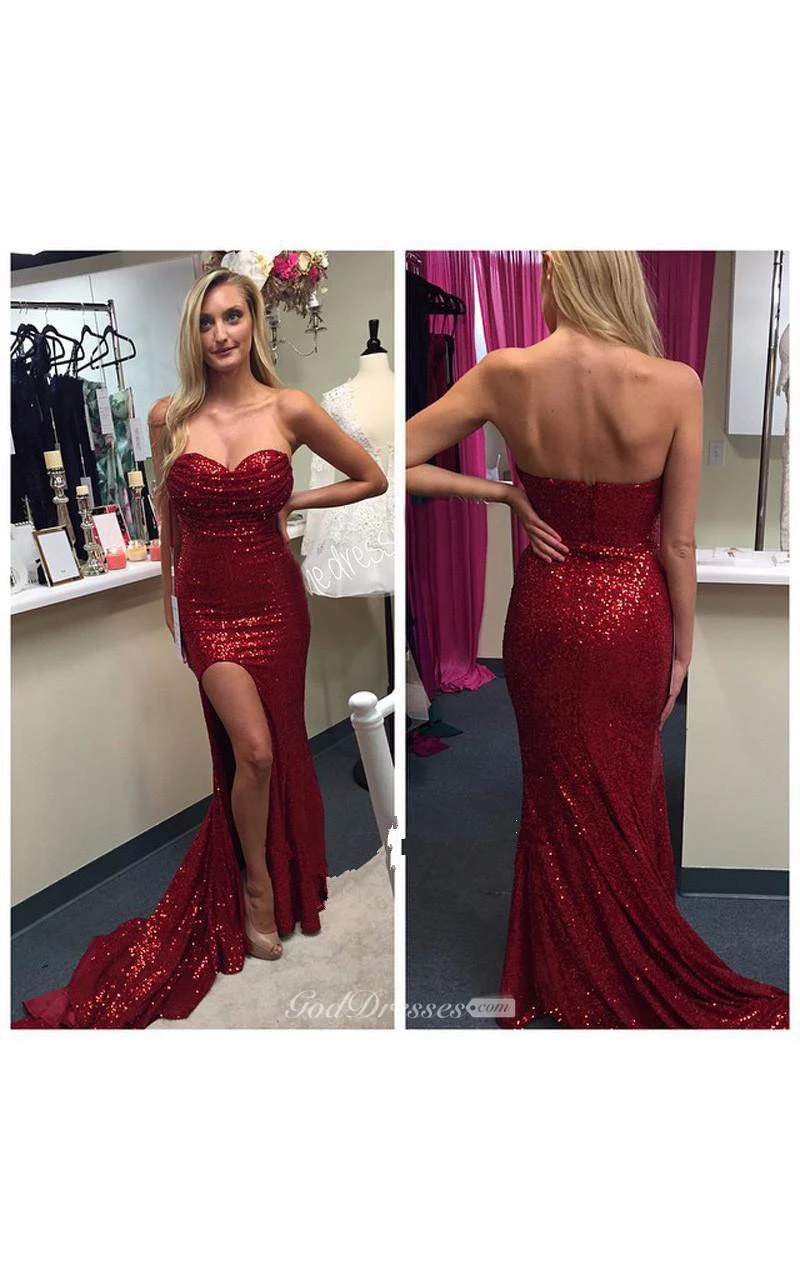 Sexy Red Sequins Prom Dresses Split Mermaid Zipper Back