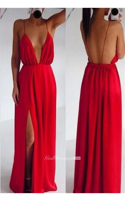Sexy Red Spaghetti Straps Prom Dress Long Deep V-Neck