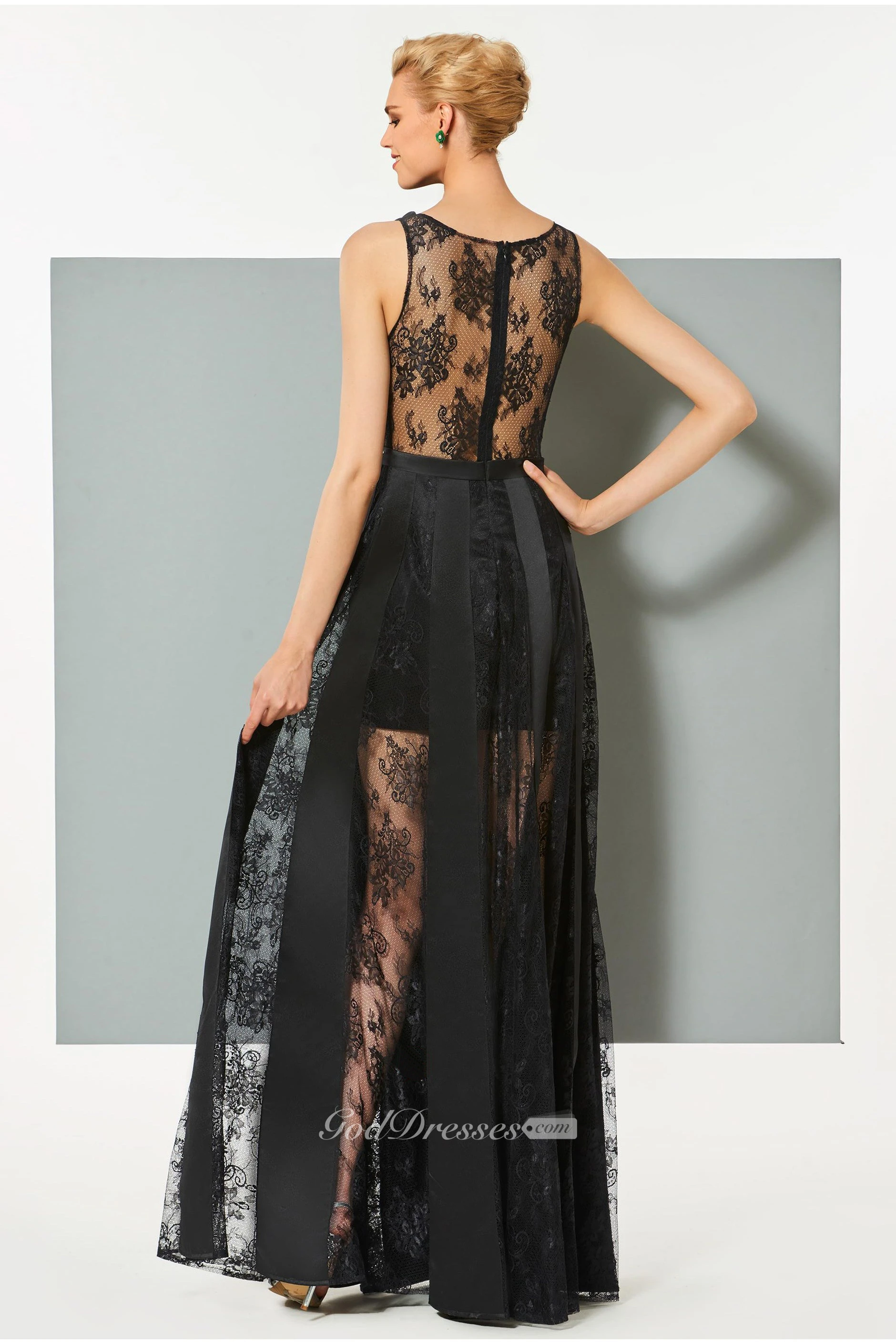 Sexy Satin and Tulle Sheath Bateau Sleeveless Appliqued Dress with Front Split