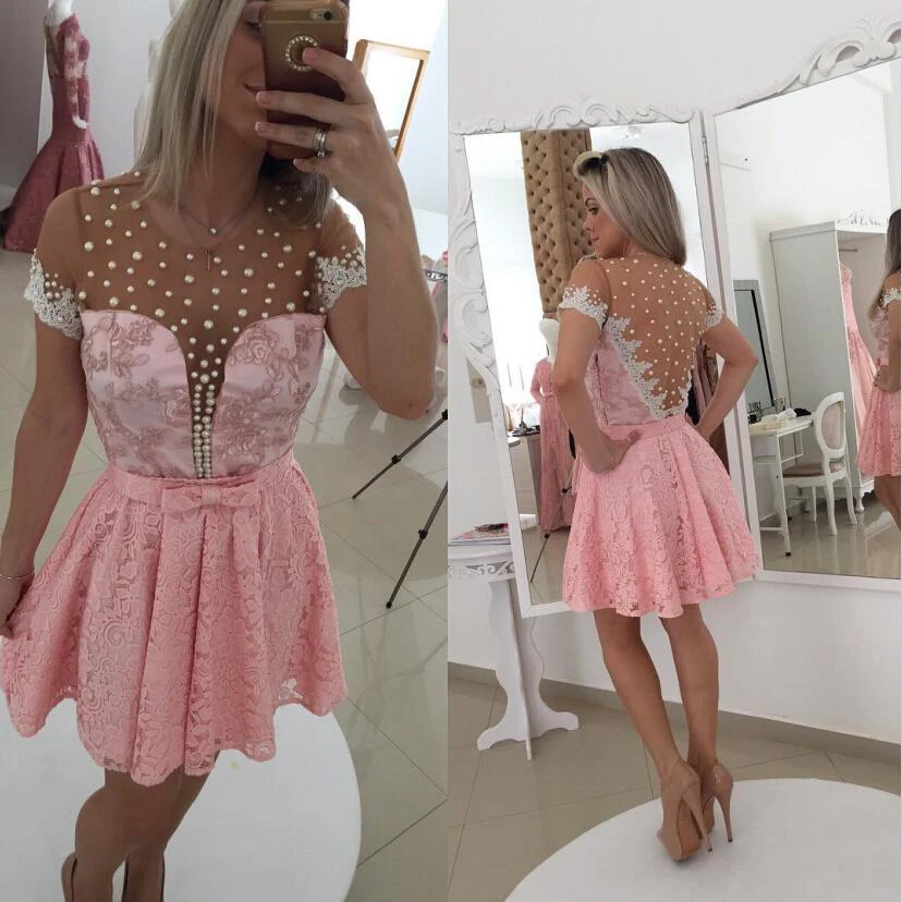 Sexy Short Sleeve Pink Cocktail Dress Lace Pearls