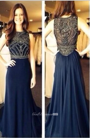 Sexy Sleeveless Navy Prom Dresses Floor Length Chiffon Top Sheer Party Gowns With Beaded Rhinestones