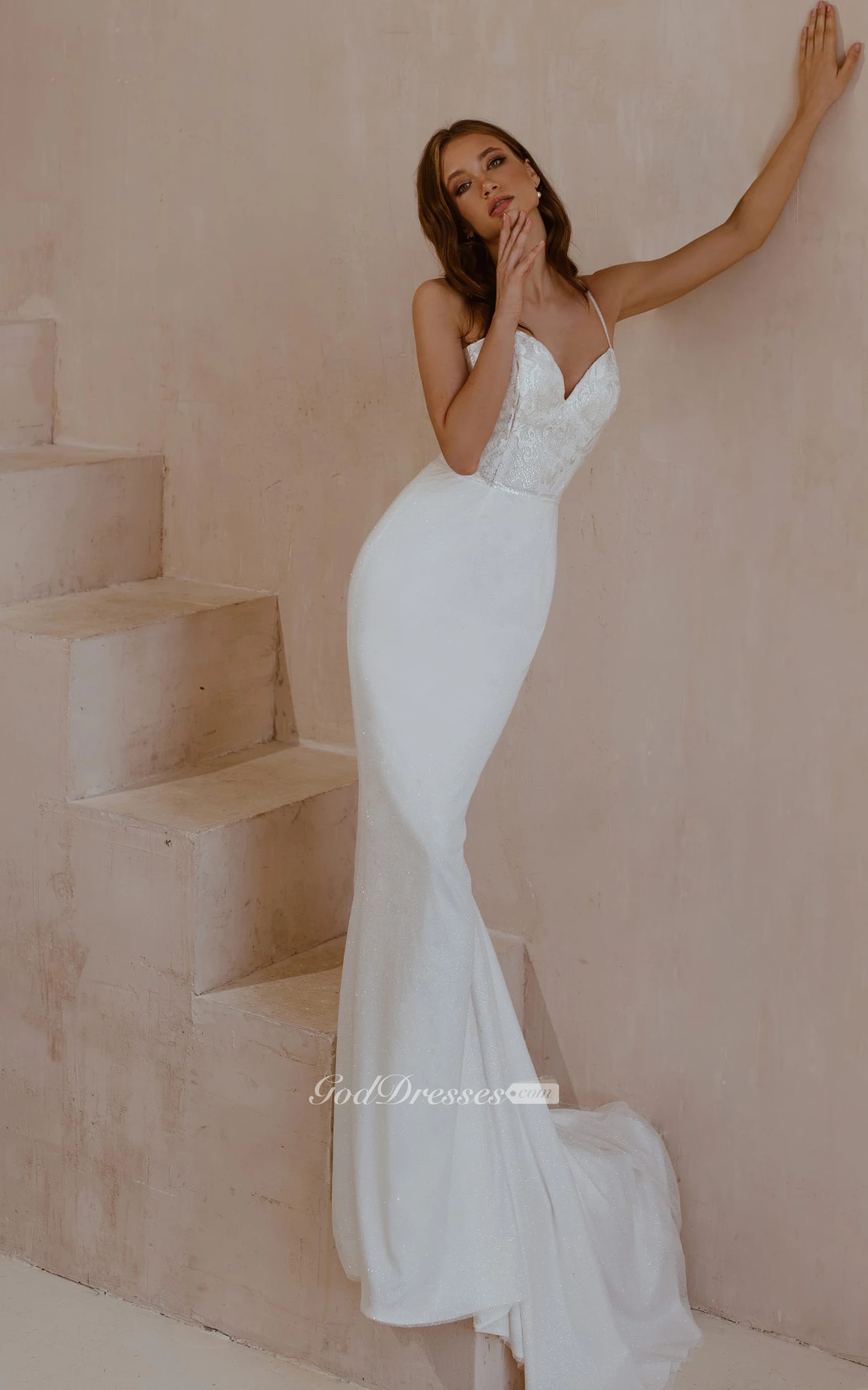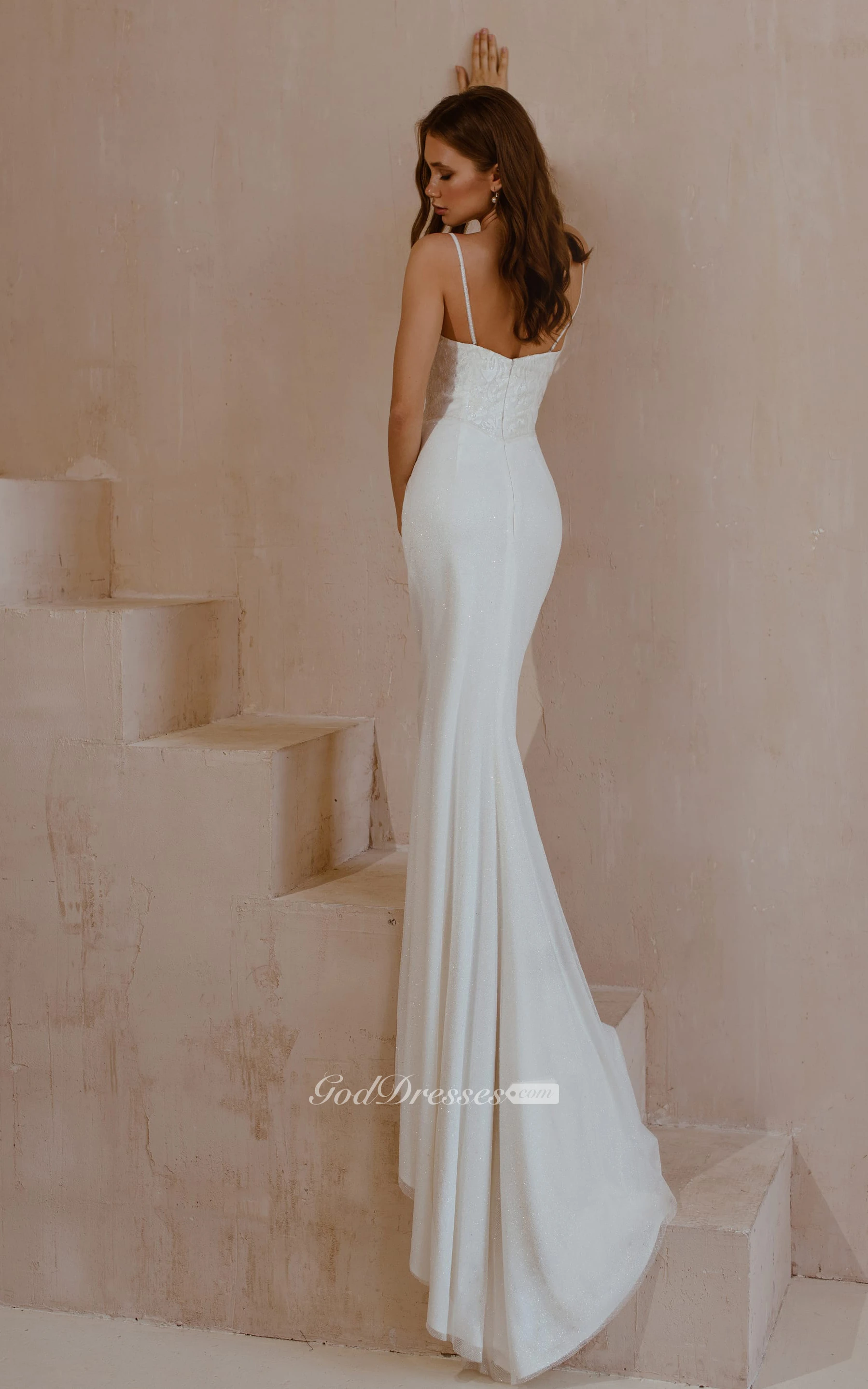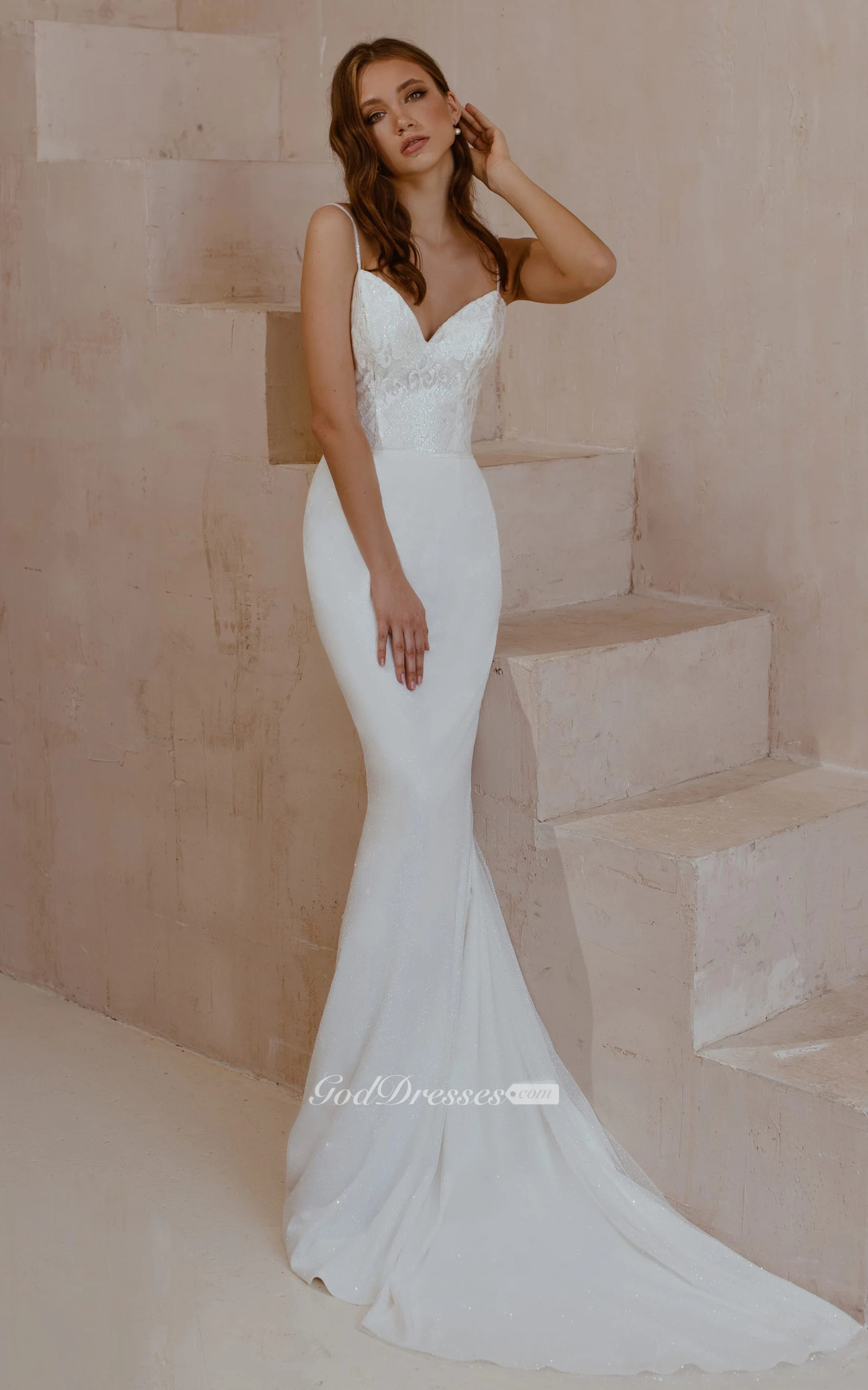 Sexy Spaghetti Satin Lace Mermaid Sleeveless Floor-length Sweep Train Wedding Dress