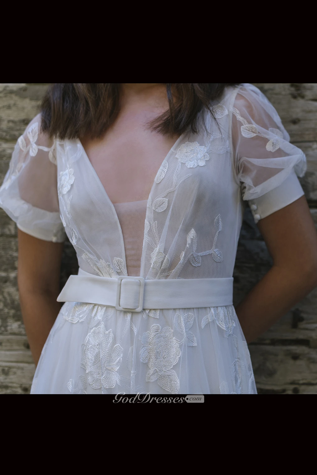 Sexy Tulle Plunging Neck Long Wedding Dress with Sash and Pleats