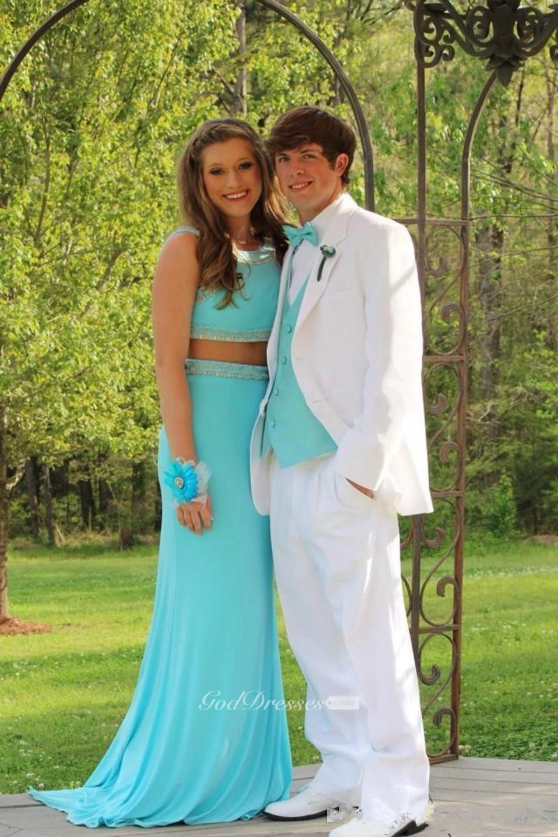 Sexy Two Piece Mermaid Beadings Prom Dress Jewel Sweep Train Sleeveless