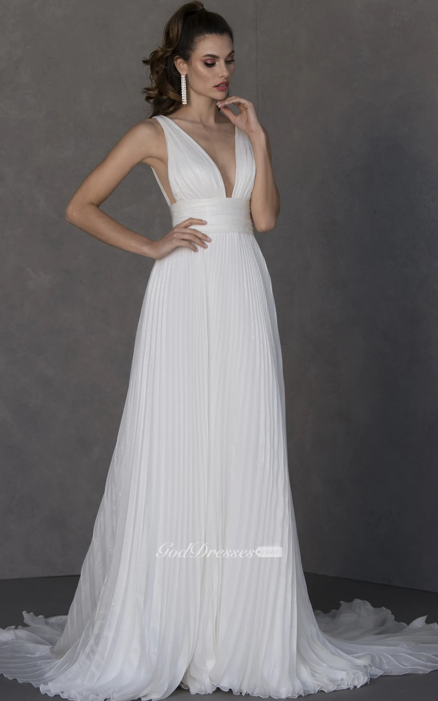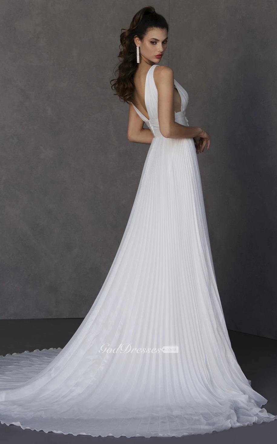 Sexy V-neck A Line Chiffon Floor-length Sleeveless Wedding Dress with Ruching