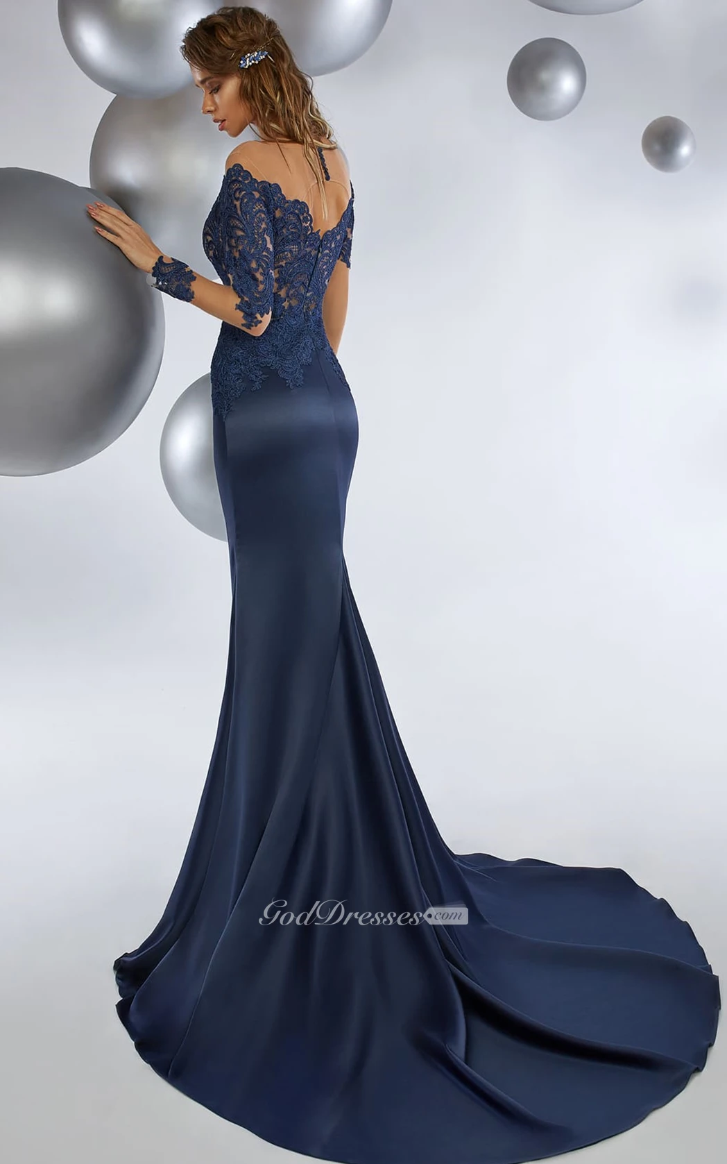 Sexy V-neck Mermaid Satin and Lace Sweep Train Prom Dress with Appliques