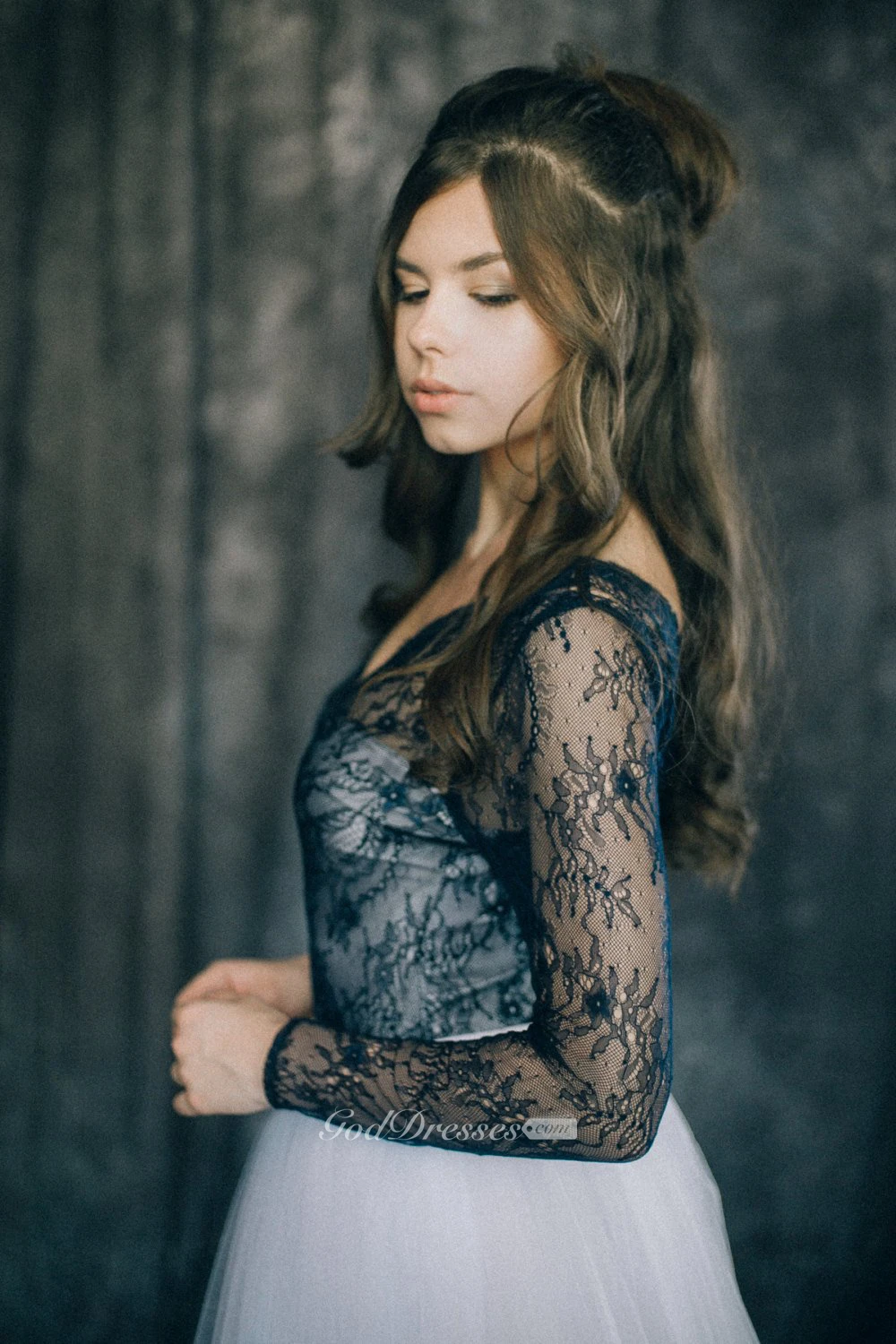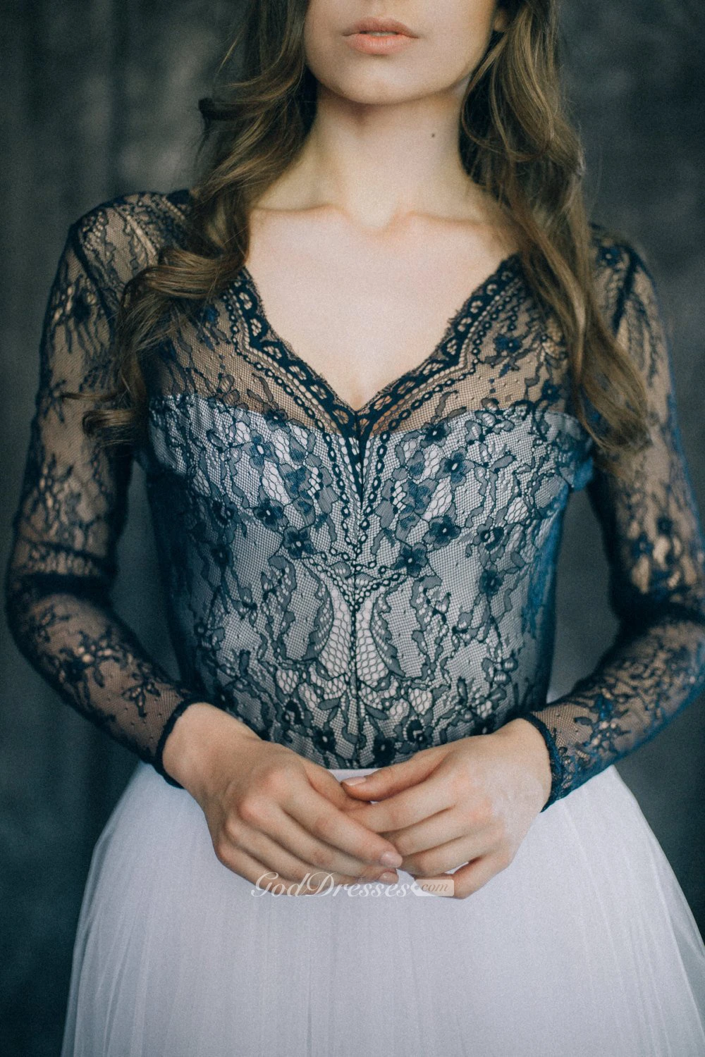 Sheath Black Wedding Dress V-neck Long Sleeve Illusion Low-V Back Lace