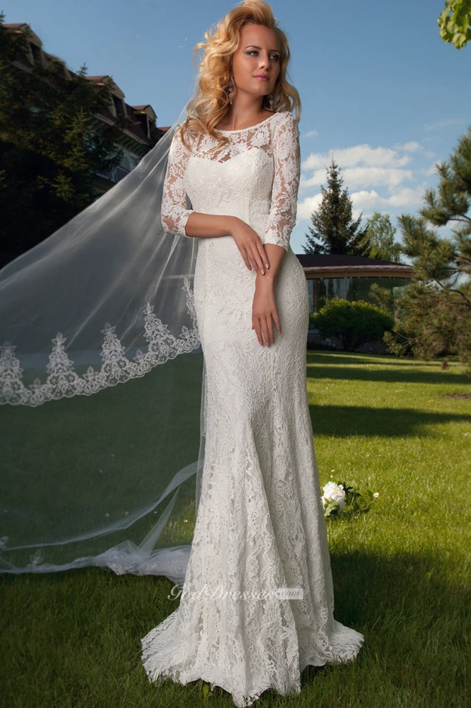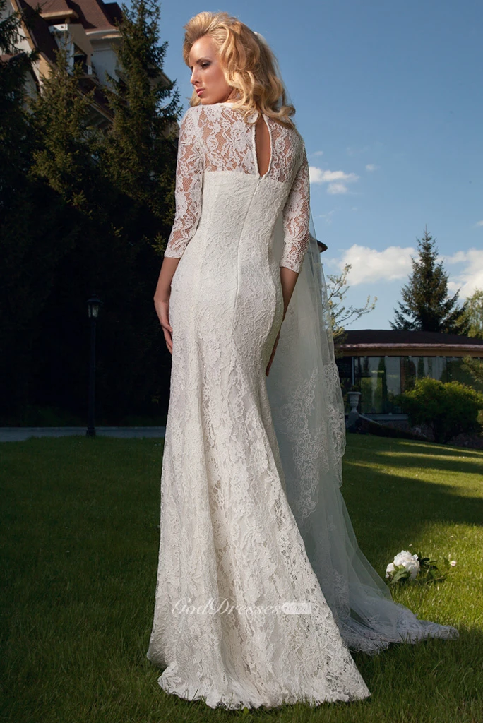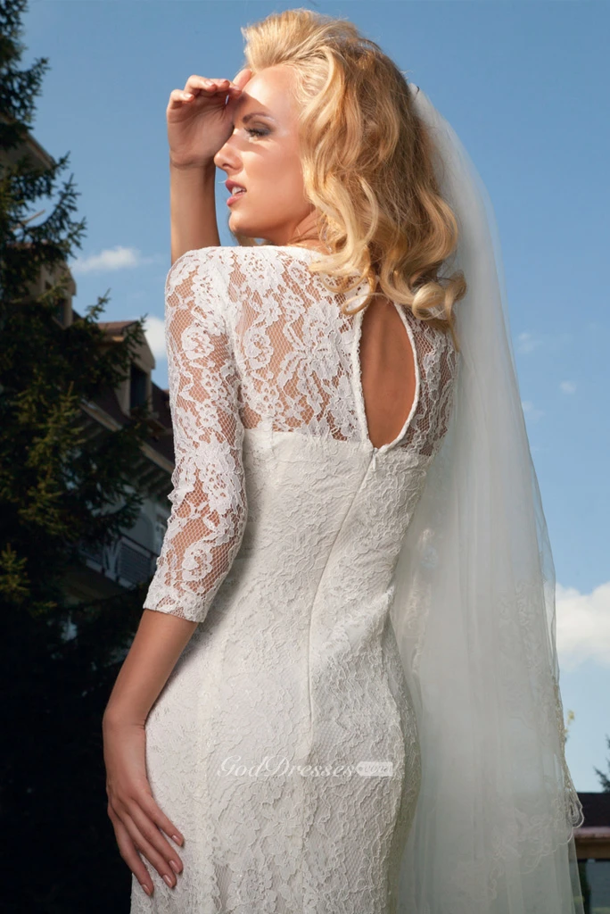 Sheath 3-4 Sleeve Appliqued Scoop Neck Lace Wedding Dress With Keyhole