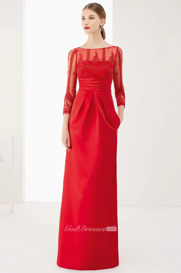 Sheath 3-4-Sleeve Floor-Length Appliqued Bateau-Neck Satin Prom Dress With Bow