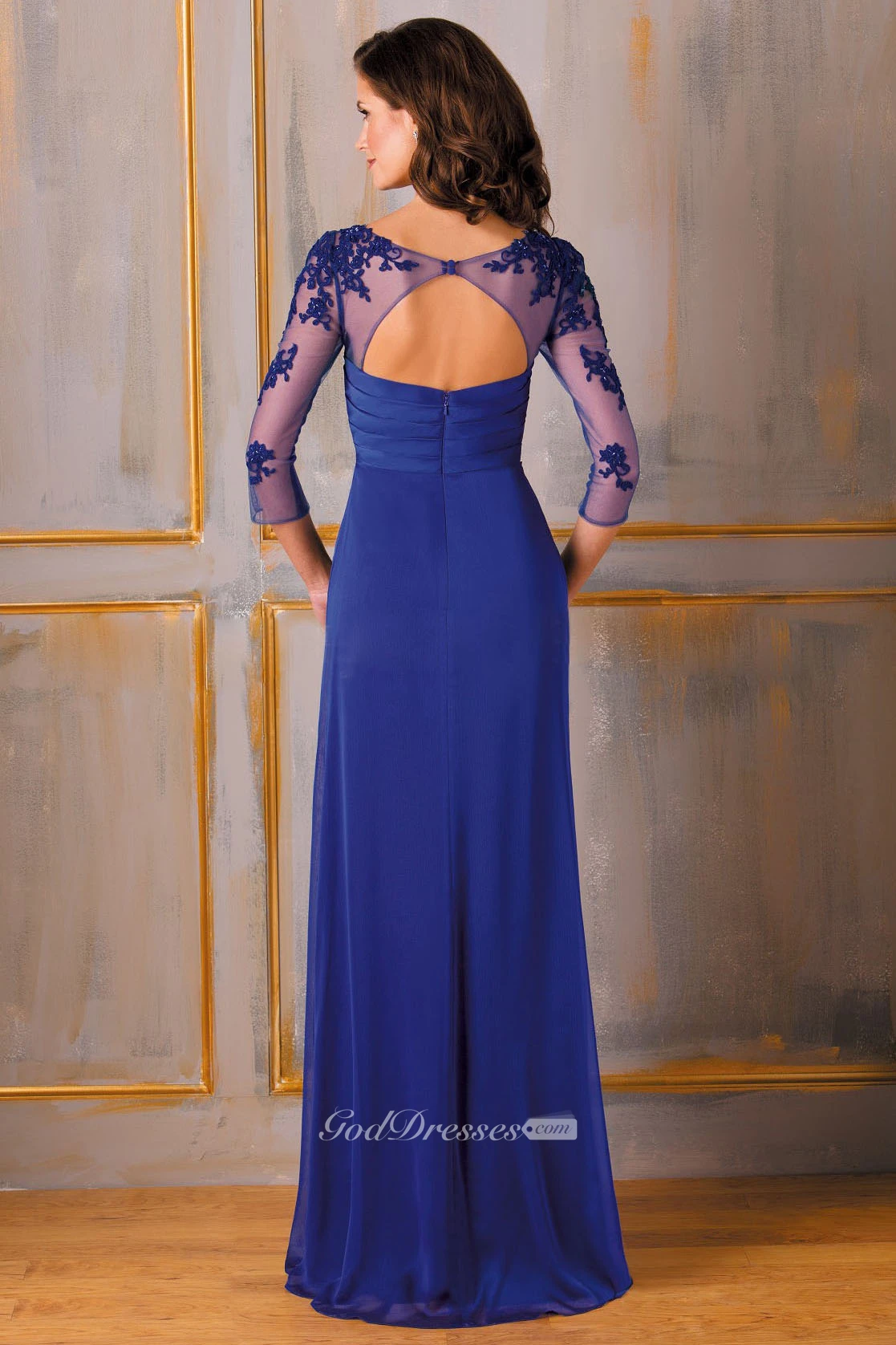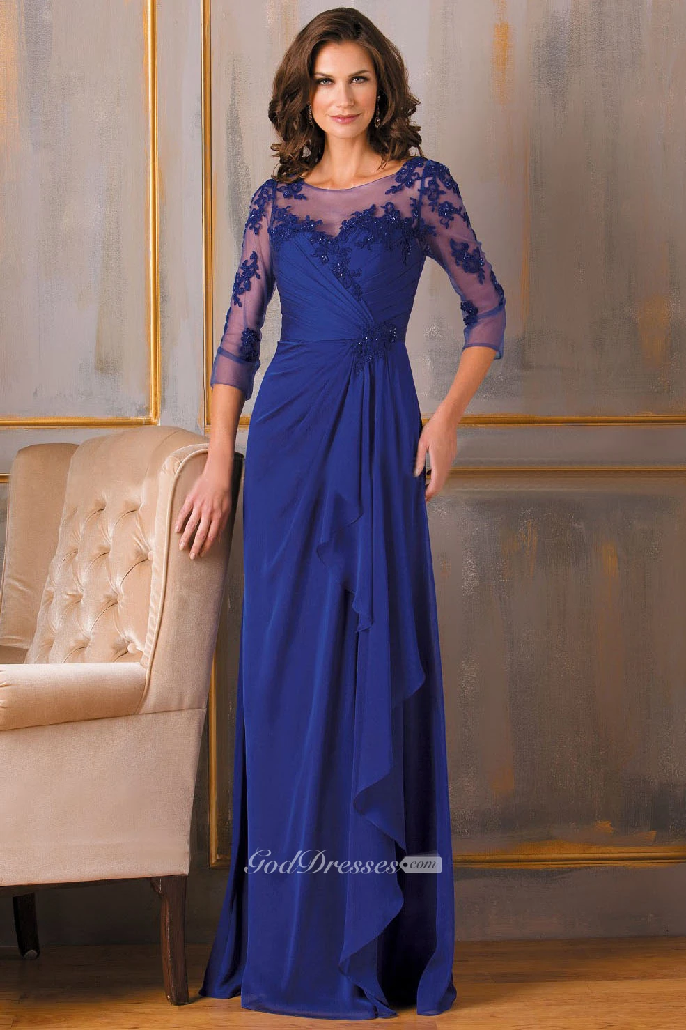 Sheath 3-4-Sleeve Floor-Length Appliqued Chiffon Mother Of The Bride Dress