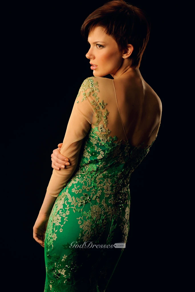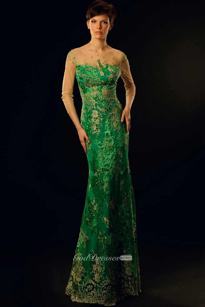 Sheath 3-4-Sleeve Maxi Appliqued Scoop-Neck Lace Prom Dress