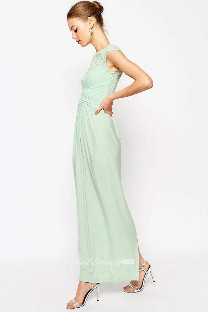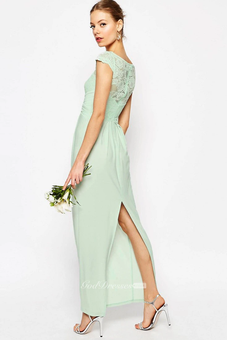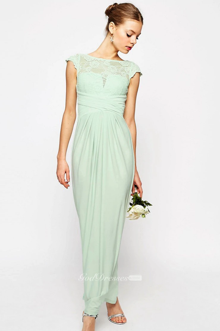 Sheath Ankle-Length Bateau Neck Cap Sleeve Lace Chiffon Bridesmaid Dress