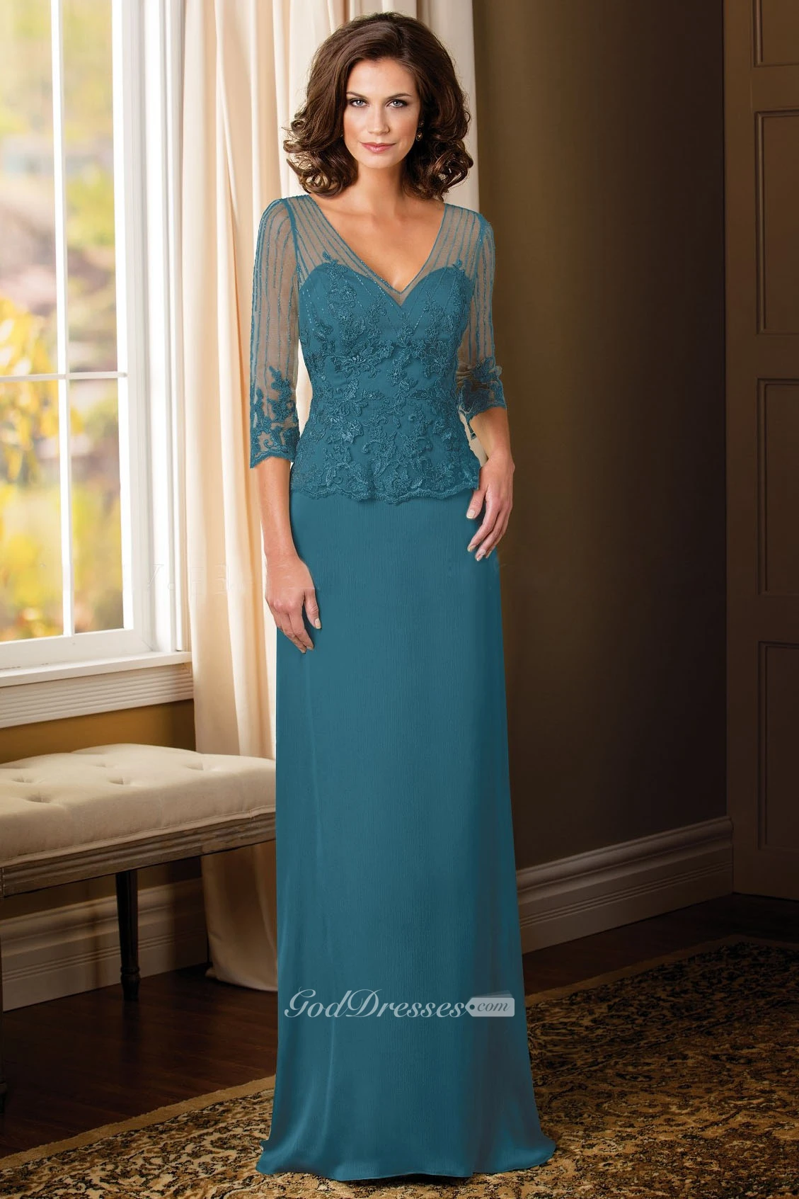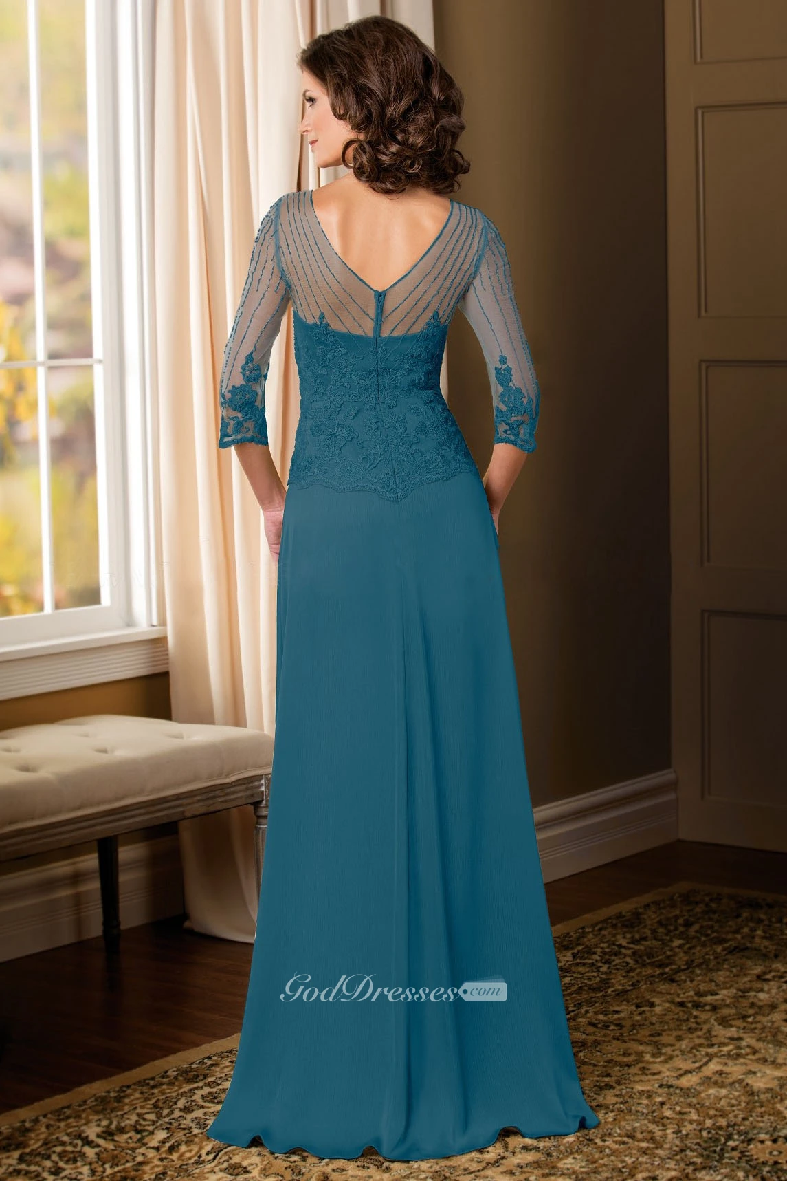 Sheath Appliqued Illusion-Sleeve V-Neck Floor-Length Chiffon Mother Of The Bride Dress With Waist Jewellery
