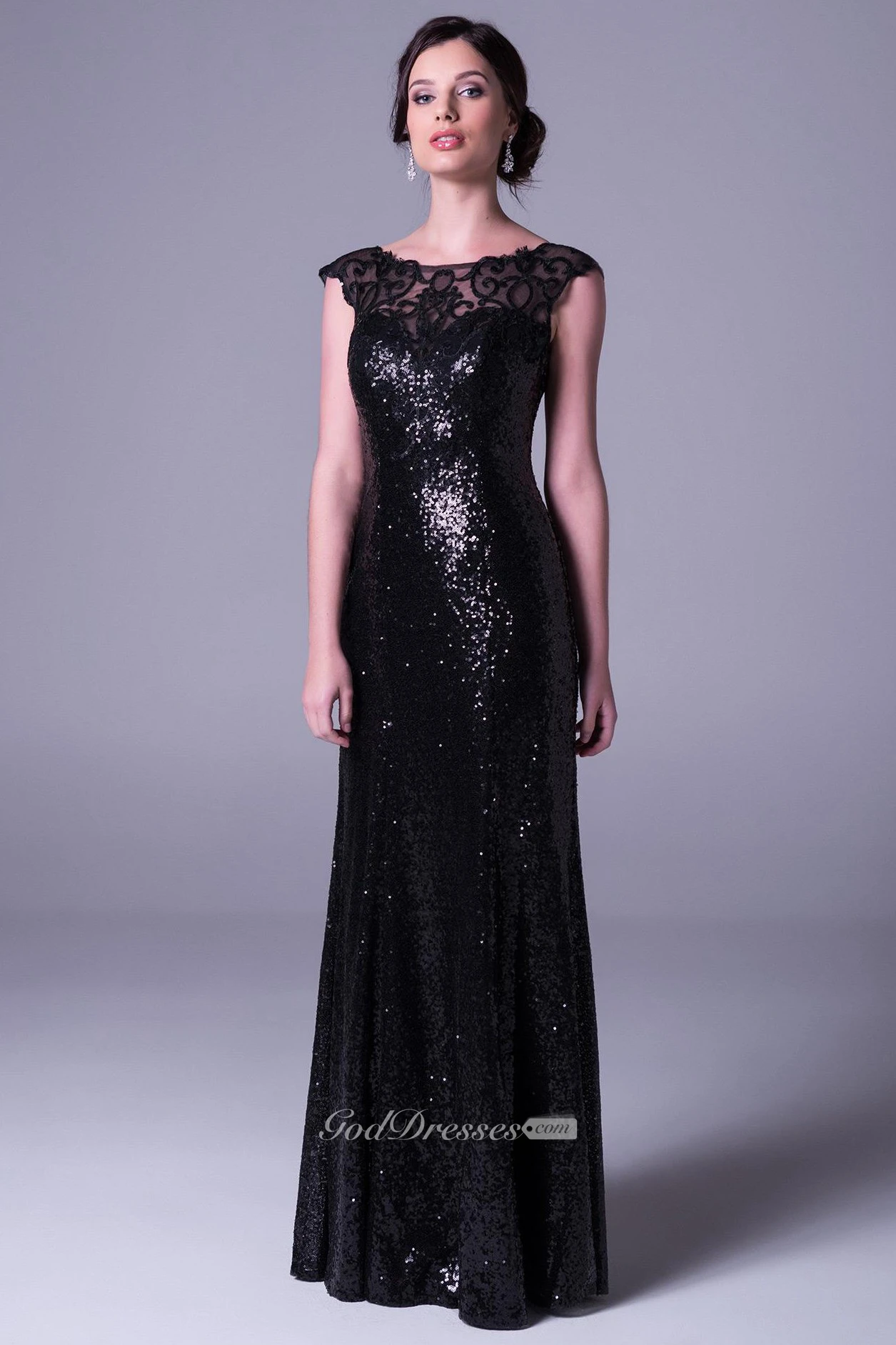 Sheath Appliqued Scoop-Neck Cap-Sleeve Floor-Length Sequins Prom Dress