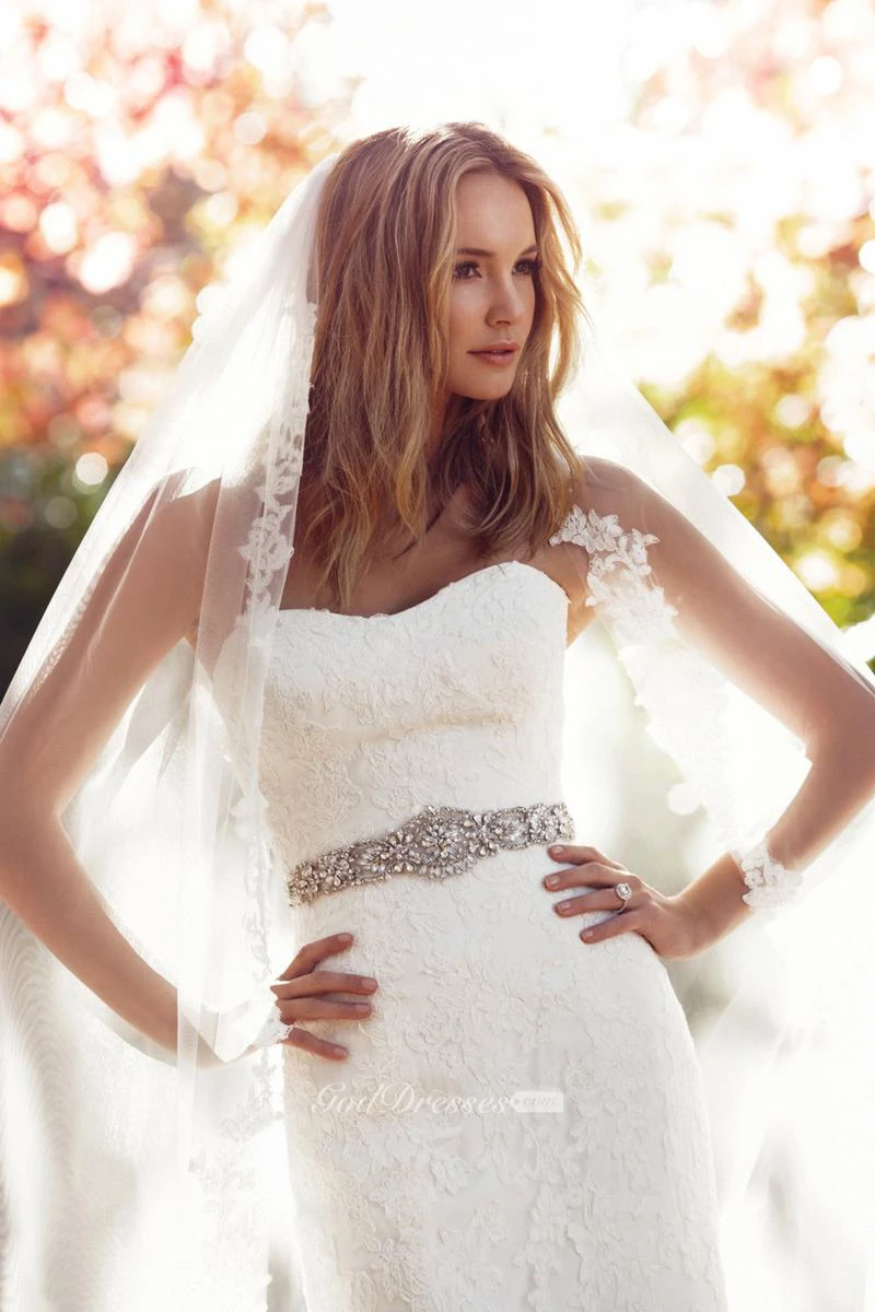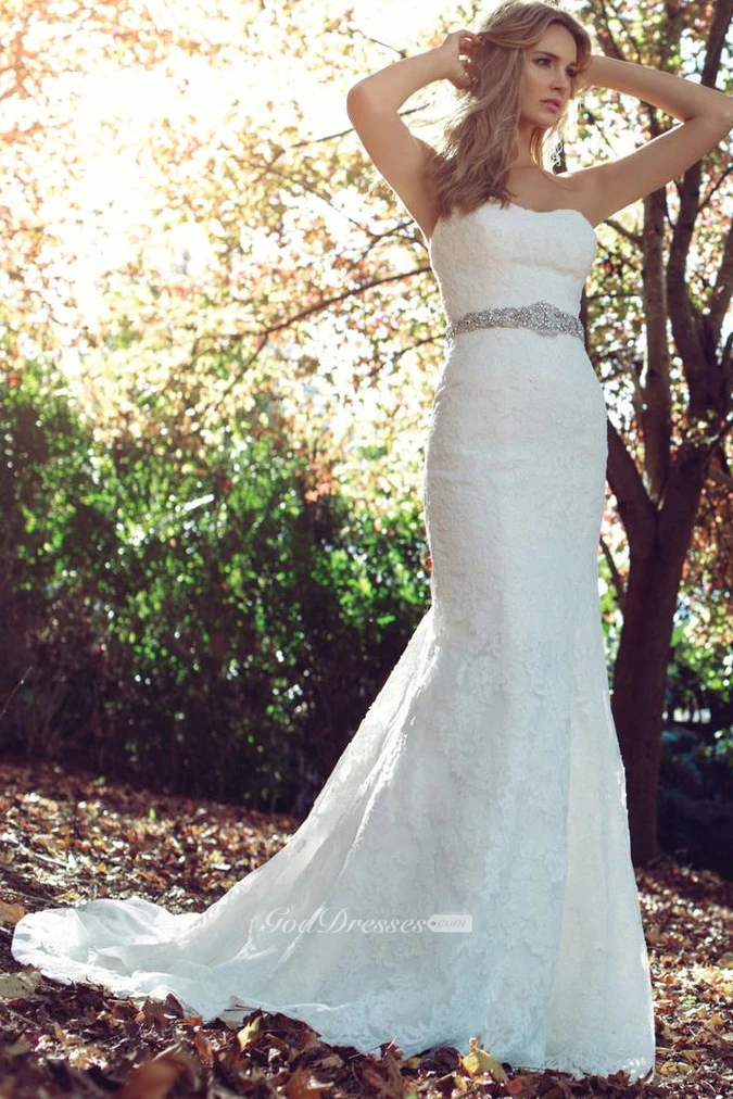 Sheath Appliqued Strapless Lace Wedding Dress With Waist Jewellery