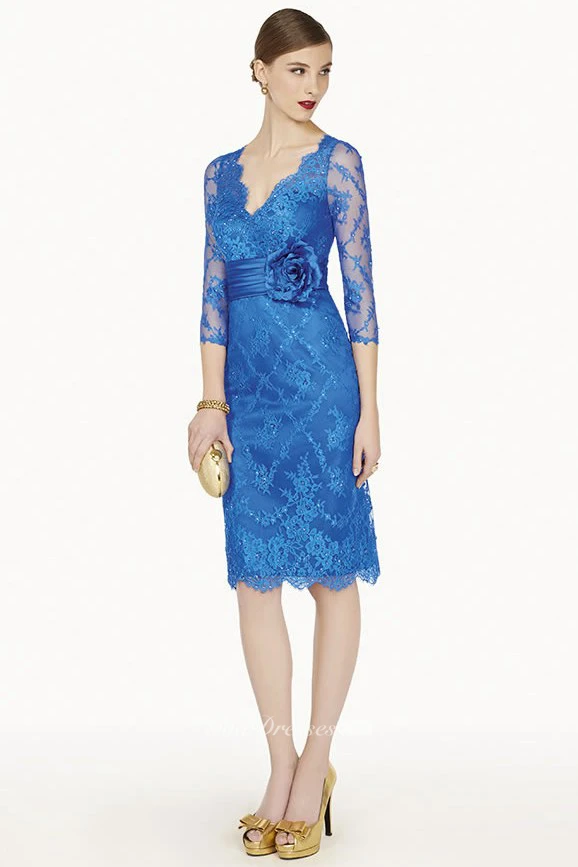 Sheath Appliqued V-Neck Knee-Length 3-4-Sleeve Lace Prom Dress With Flower And Beading