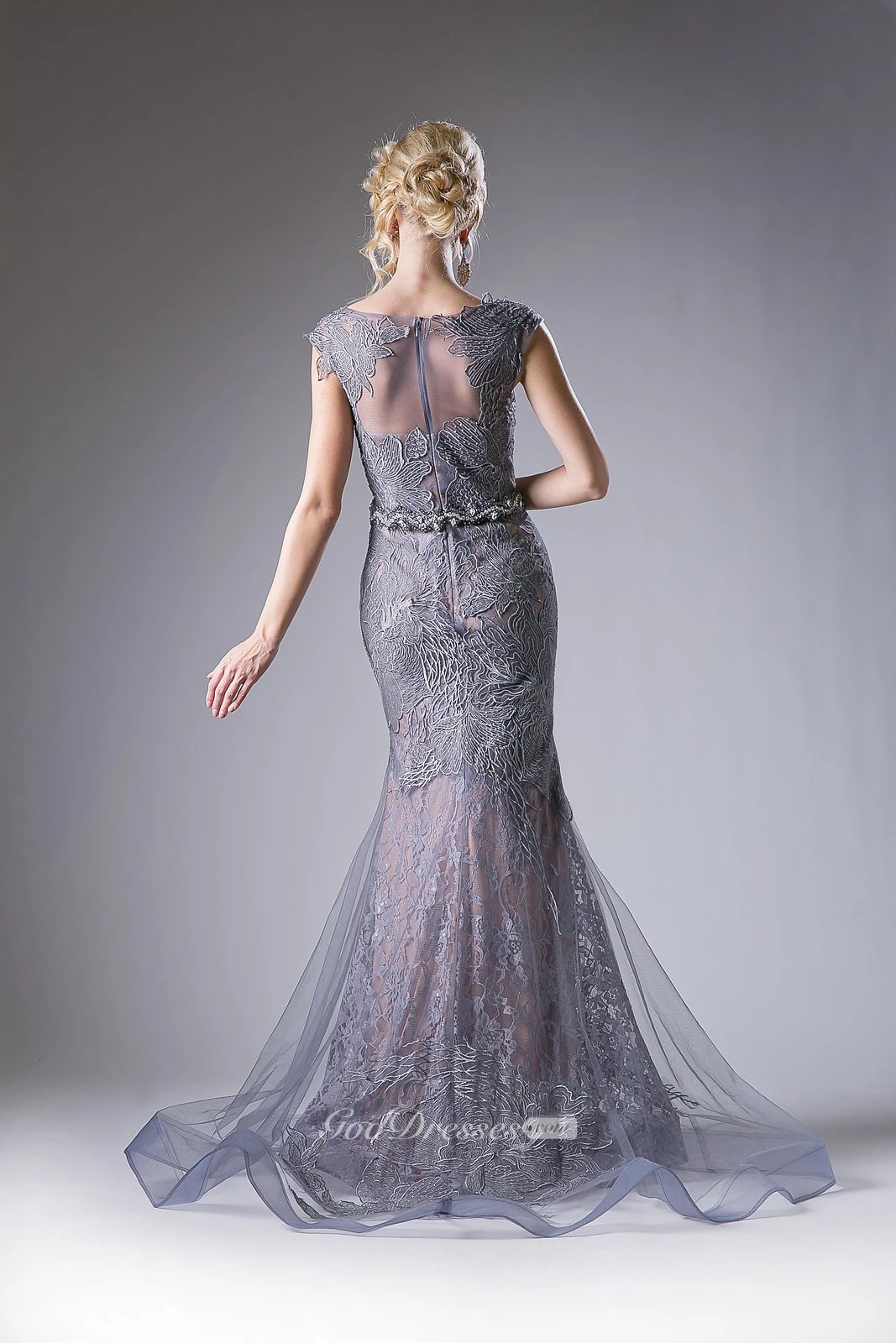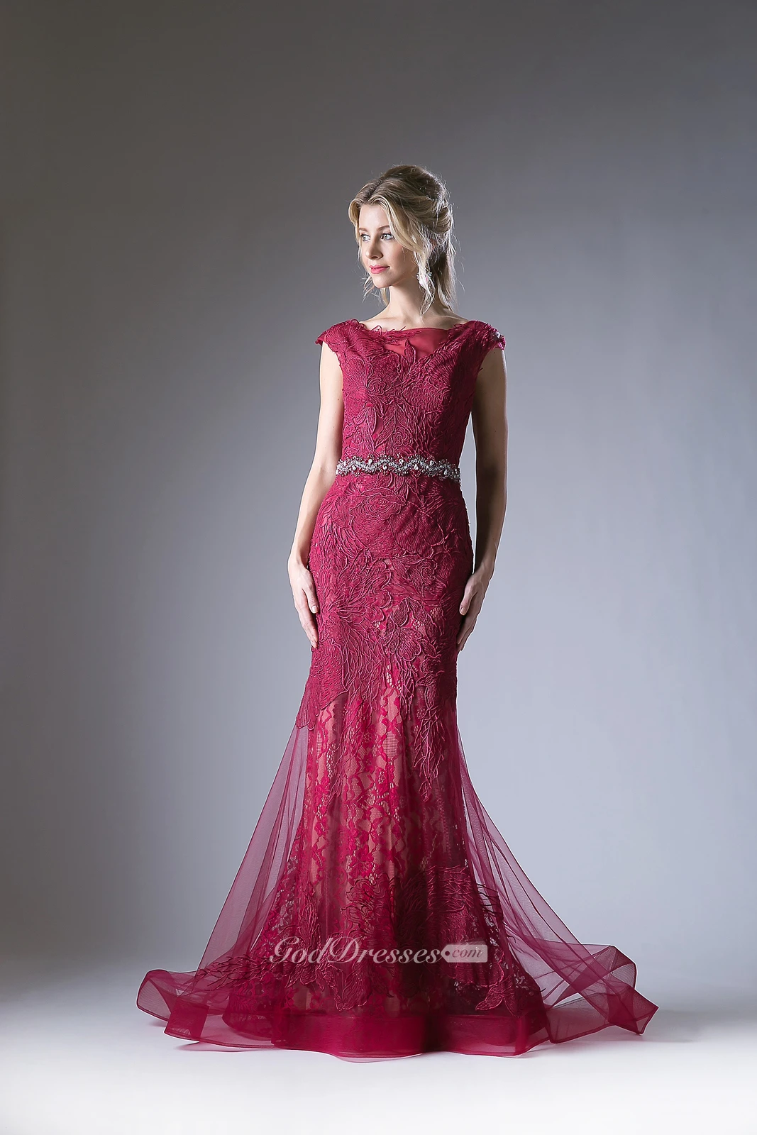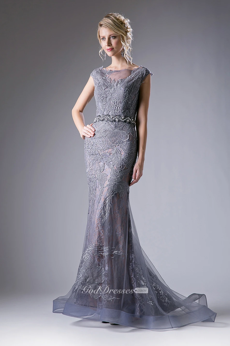 Sheath Bateau Cap-Sleeve Lace Illusion Dress With Appliques And Ruffles