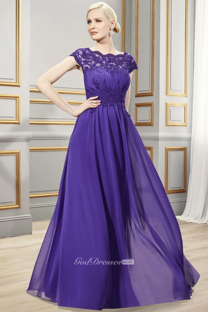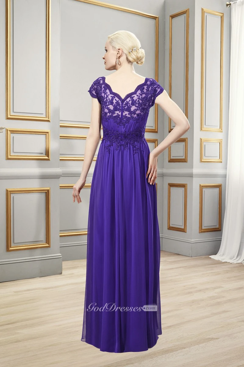 Sheath Bateau-Neck Appliqued Long Cap-Sleeve Chiffon Formal Dress With Ruching