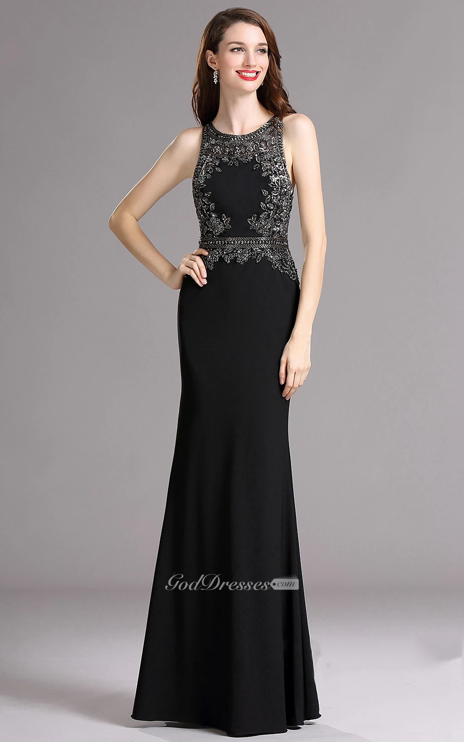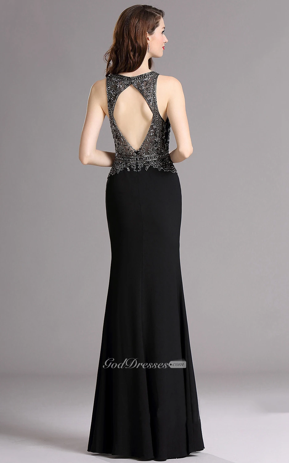 Sheath Bateau Sleeveless Jersey Beading Keyhole Dress