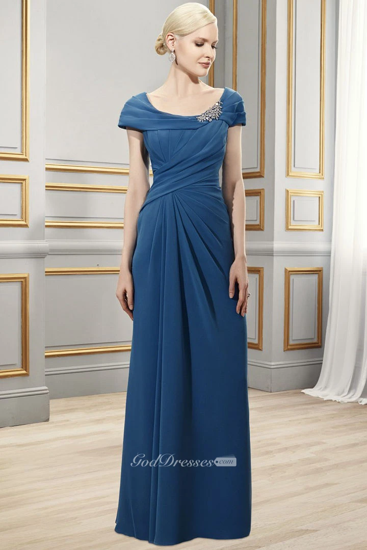 Sheath Broach Floor-Length Scoop Short-Sleeve Chiffon Formal Dress With Zipper Back And Draping