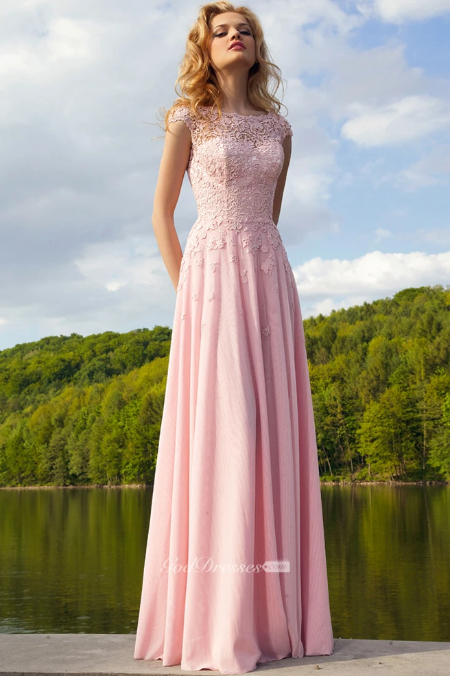 Sheath Cap-Sleeve Bateau-Neck Appliqued Floor-Length Chiffon Prom Dress