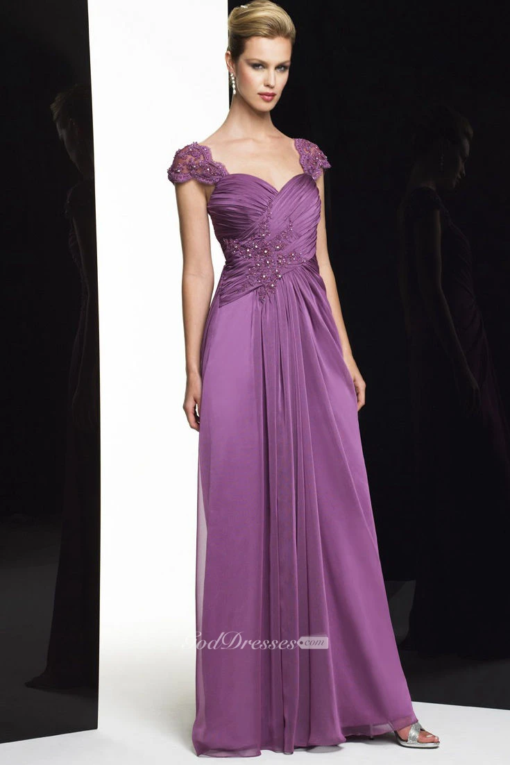 Sheath Cap-Sleeve Criss-Cross Long Sweetheart Satin Chiffon Formal Dress With Beading