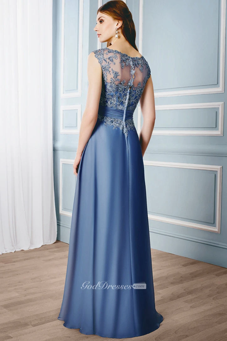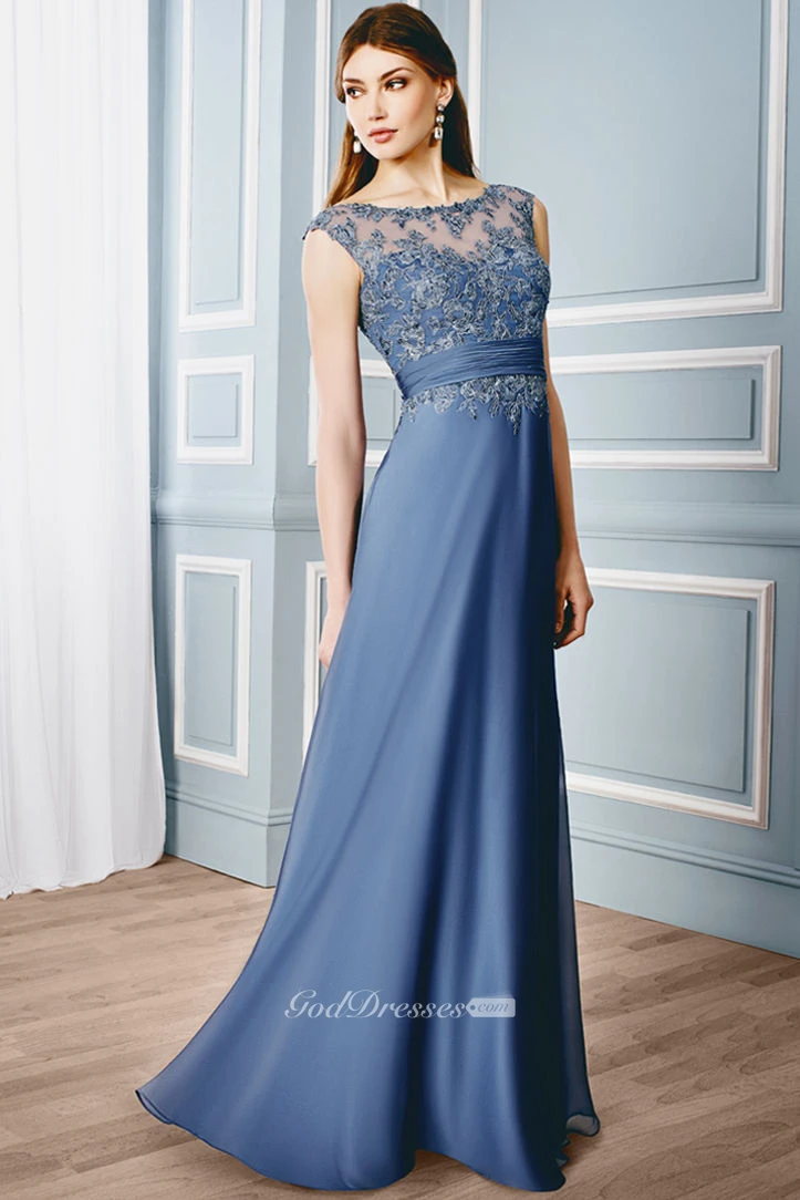 Sheath Cap-Sleeveless Bateau Floor-Length Appliqued Formal Dress With Illusion Back